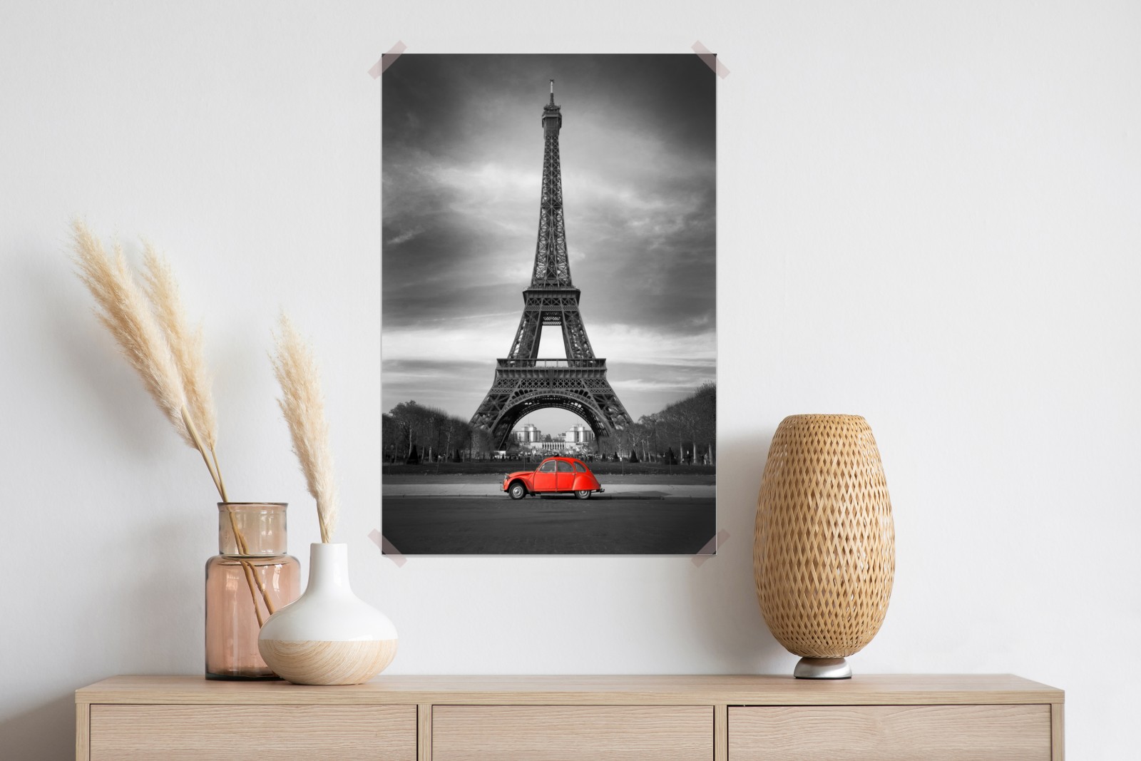 Verleihen Sie Ihrem Raum urbanen Charme mit einem schwarz-weiß Motiv des Eiffelturms und einem leuchtend roten Oldtimer im Vordergrund.