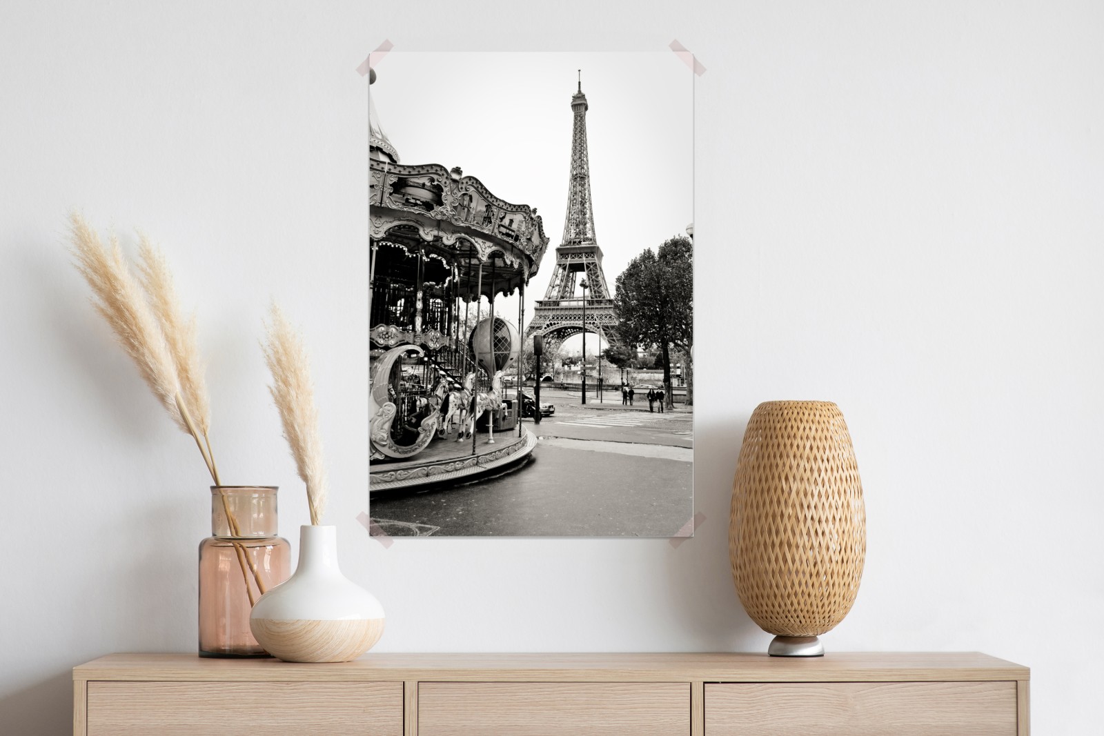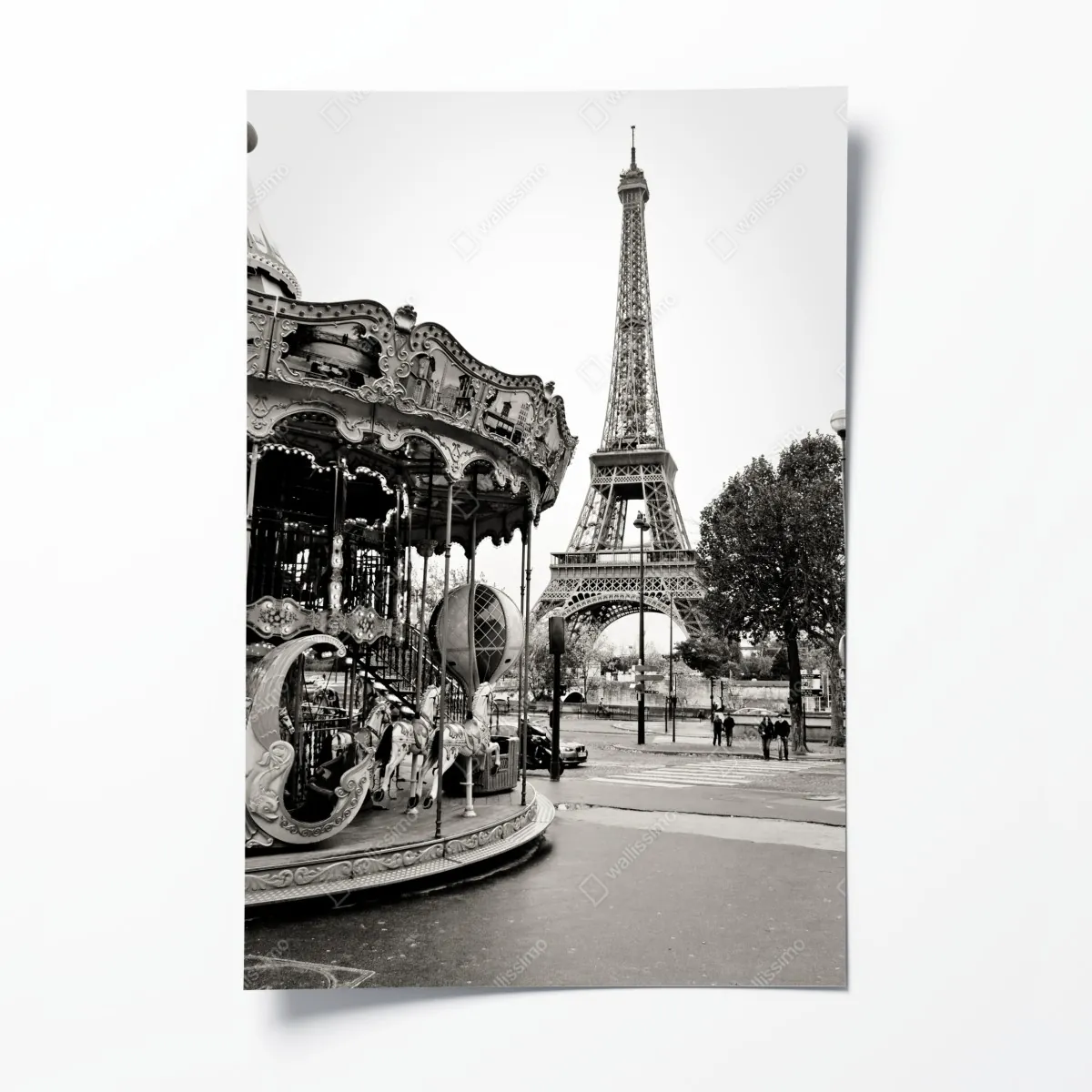 Bringen Sie zeitlosen Pariser Charme in Ihr Zuhause mit diesem schwarz-weißen Motiv von Eiffelturm und Karussell.