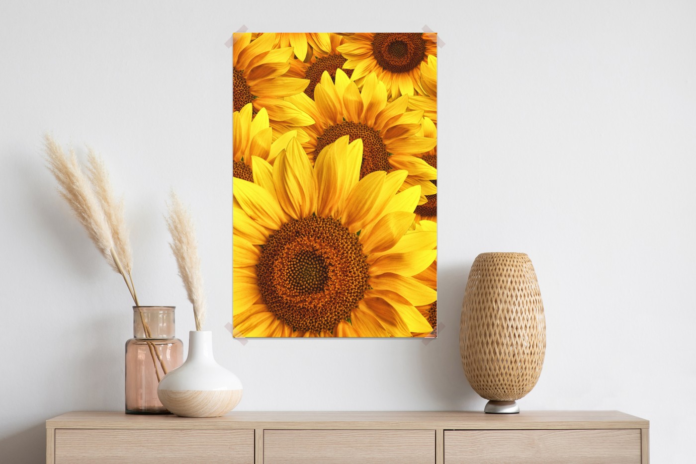 Bringen Sie Wärme und Freude in jeden Raum mit dieser Nahaufnahme lebendiger Sonnenblumen, die einen fröhlichen, naturinspirierten Blickfang schaffen.MehrWeniger