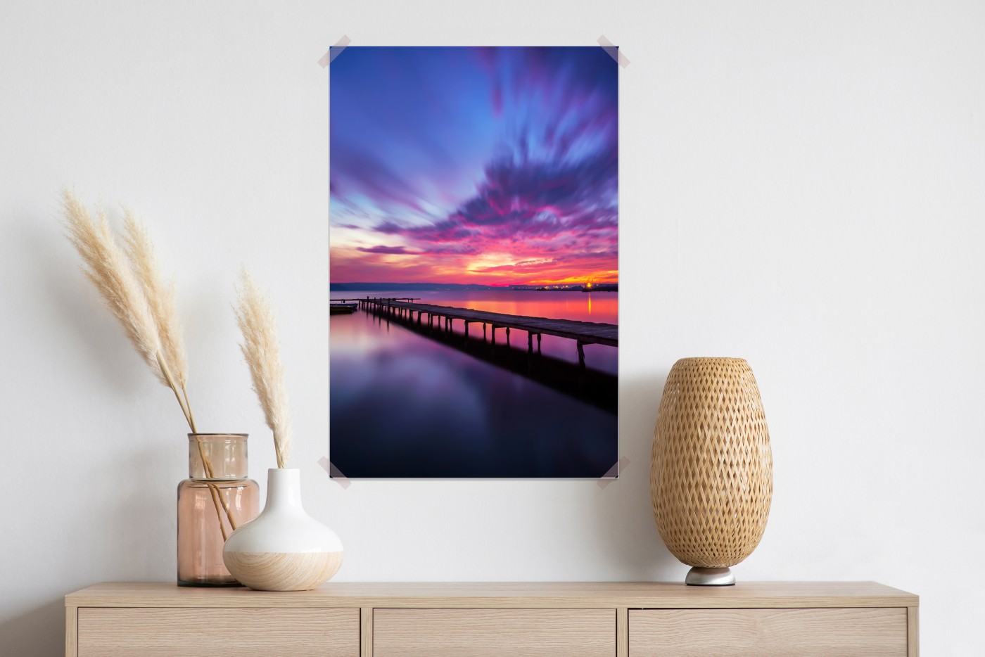 Poster sonnenuntergang über ruhigem see mit hölzernem steg – Wallnifity®