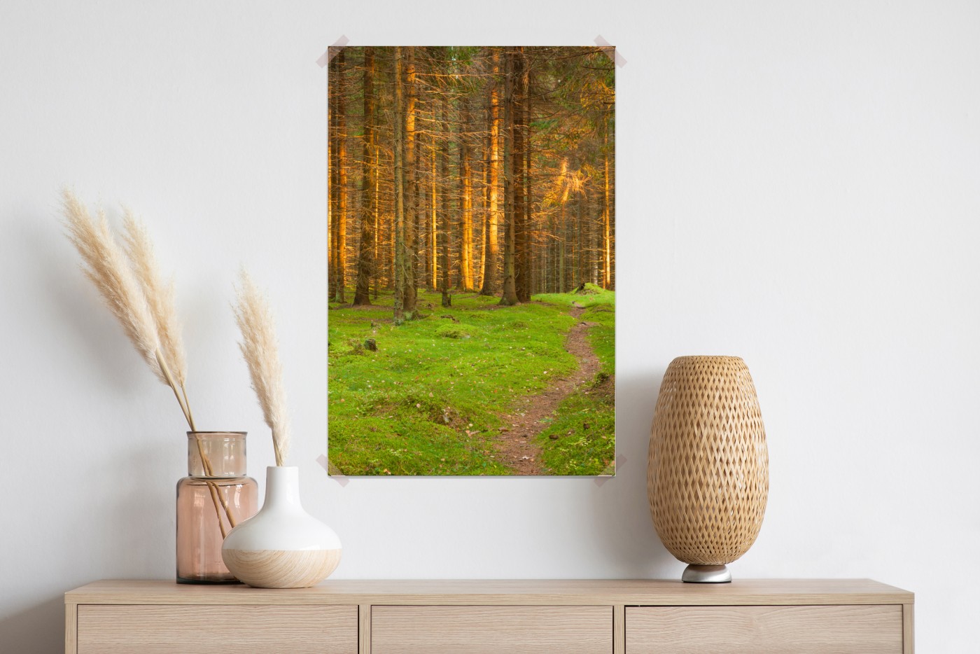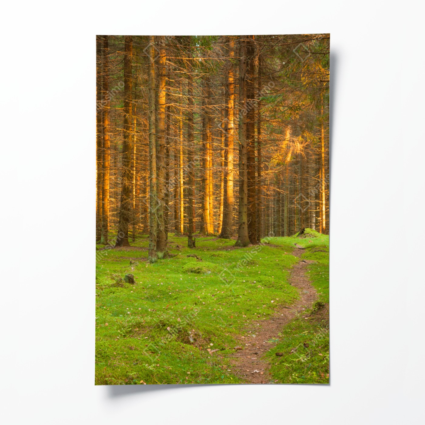 Poster goldenes licht im moosbedeckten kiefernwald – Wallnifity®