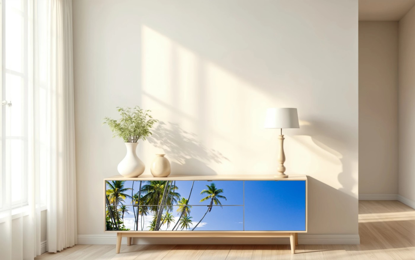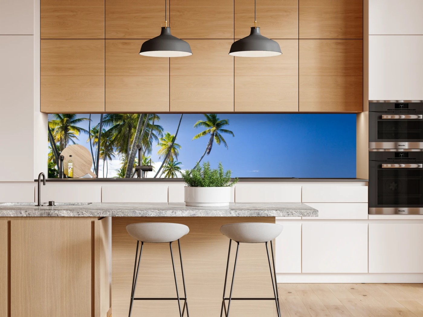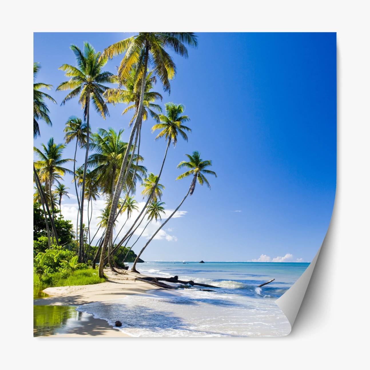 Repositionierbarer Aufkleber Tropischer palmenstrand unter blauem himmel