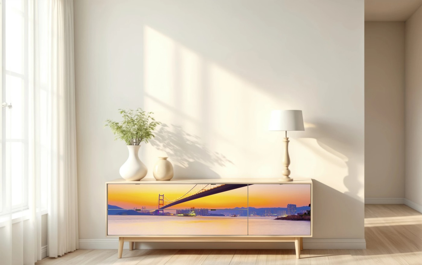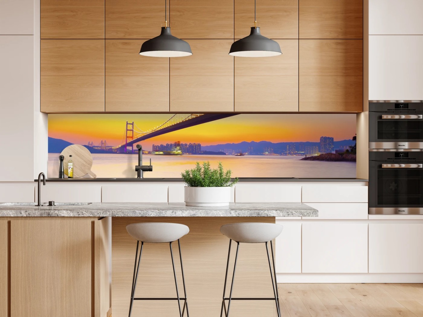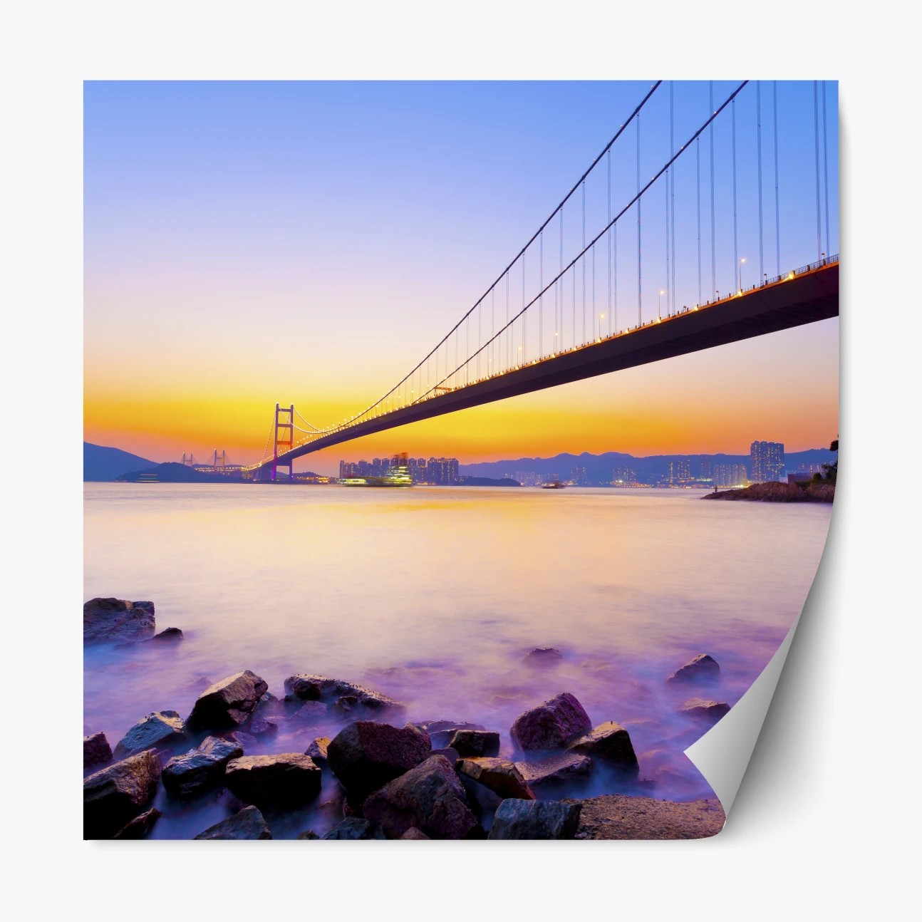 Repositionierbarer Aufkleber Goldener sonnenuntergang über hängebrücke