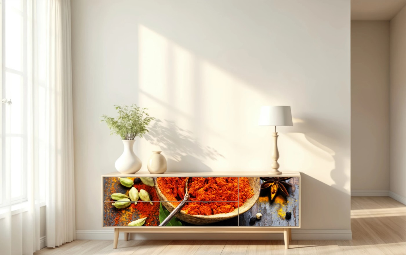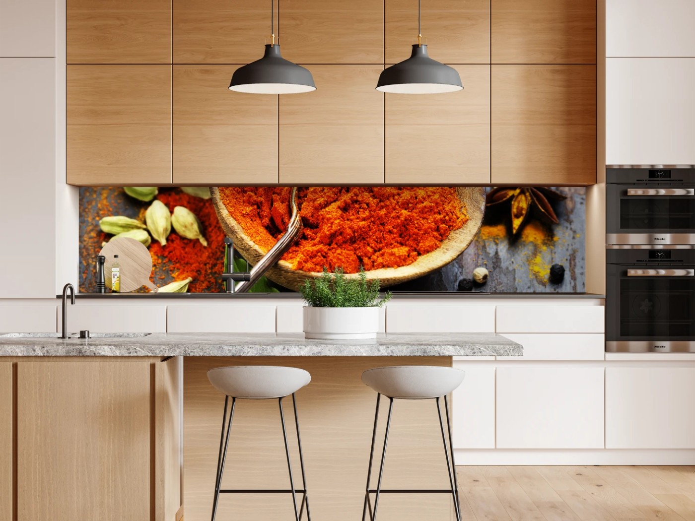 Repositionierbarer Aufkleber Bunte gewürze und kräuter auf holz