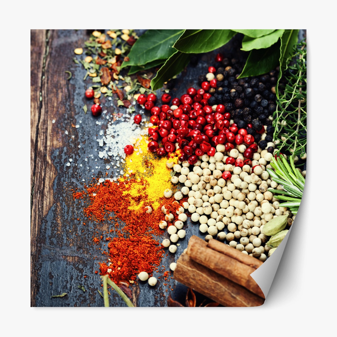 Repositionierbarer Aufkleber Buntes gewürzsortiment auf rustikalem holz