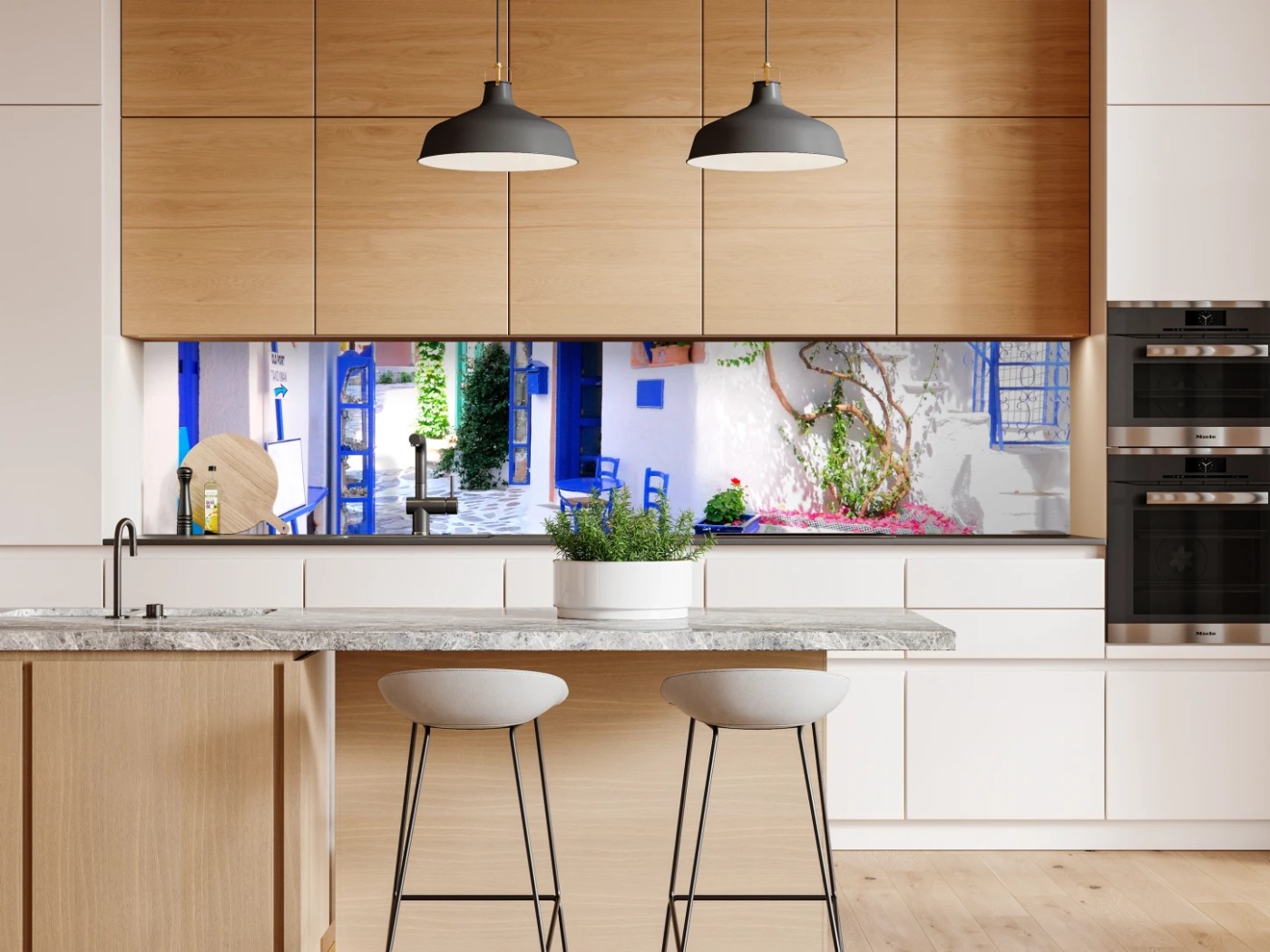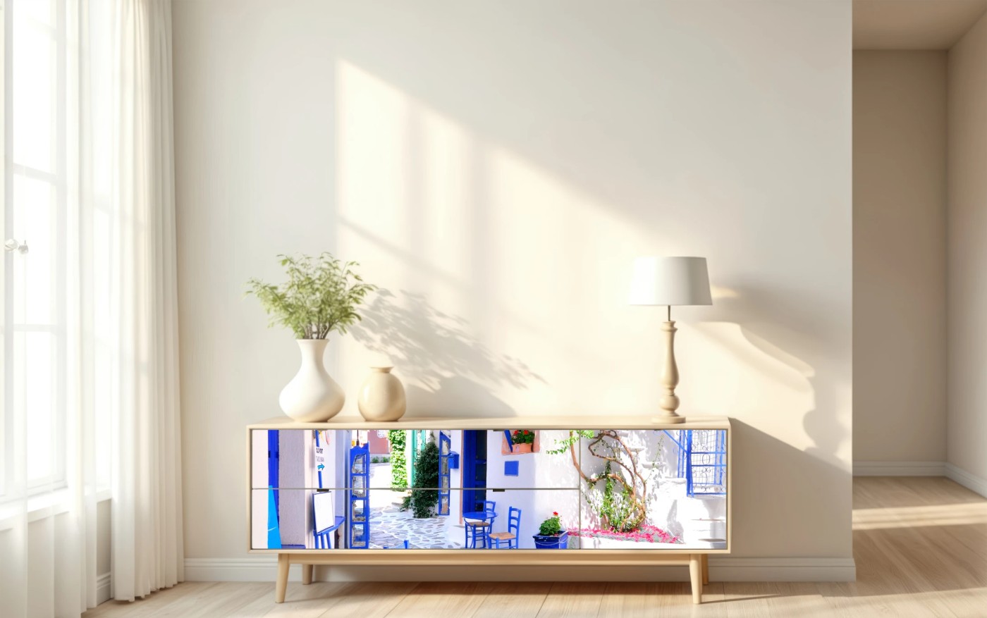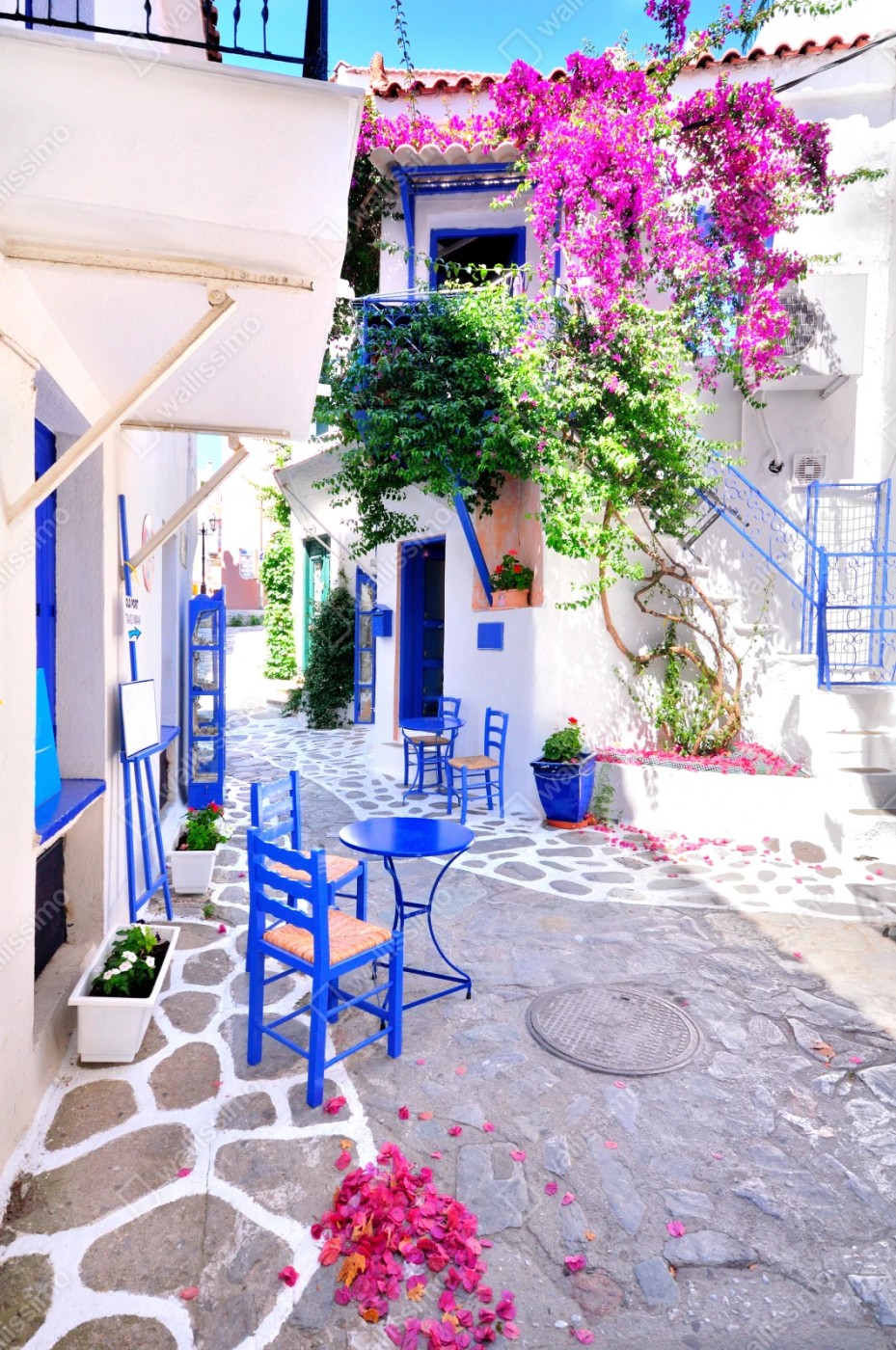 Repositionierbarer Aufkleber Sonnige gasse mit blauen stühlen