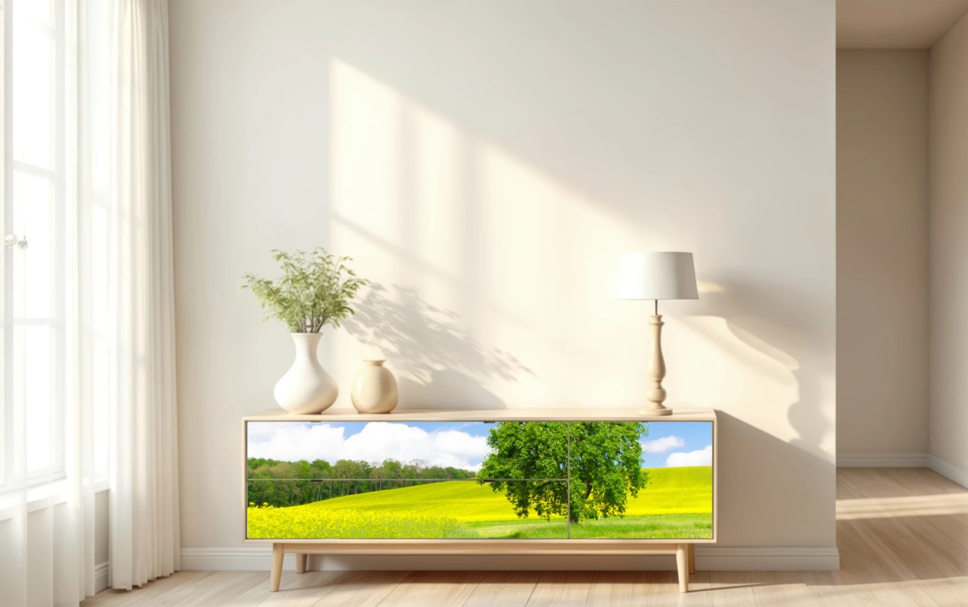 Repositionierbarer Aufkleber Sonniger feldweg mit einsamem baum