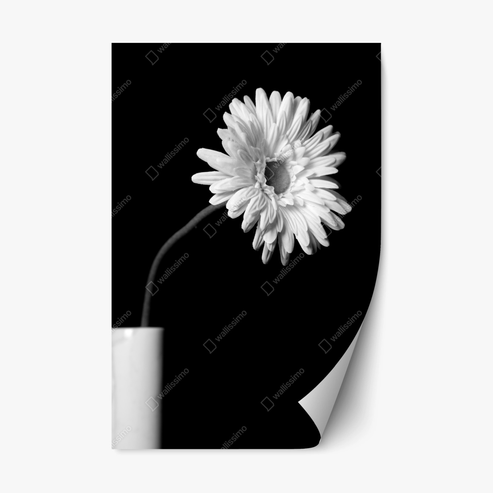 - botanisch, schwarzweiß, minimalistisch, nahaufnahme, schwarzer hintergrund, blumenkunst, gerbera, vase, weiße blume, stiel