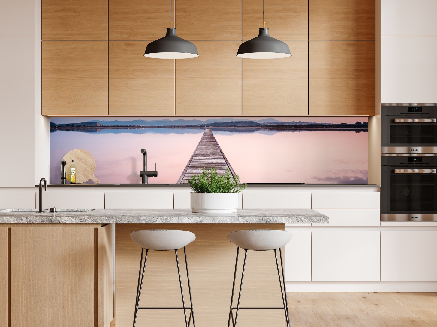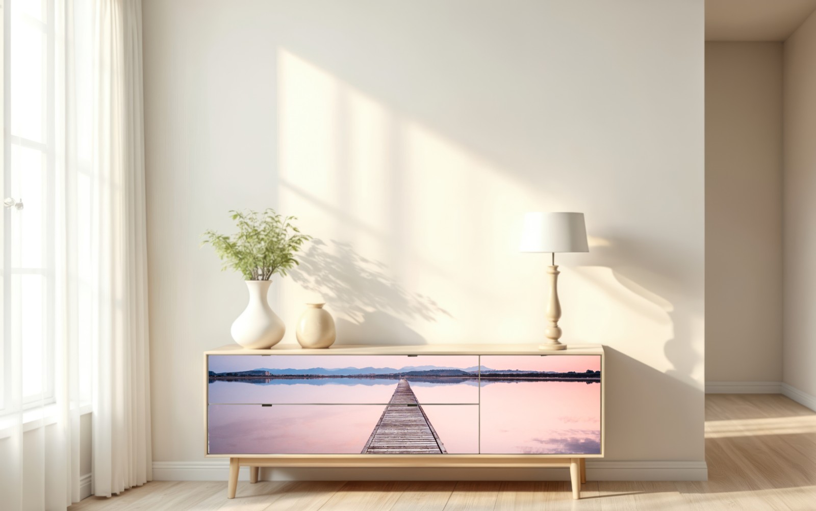 Repositionierbarer Aufkleber Holzsteg zum horizont bei sonnenuntergang
