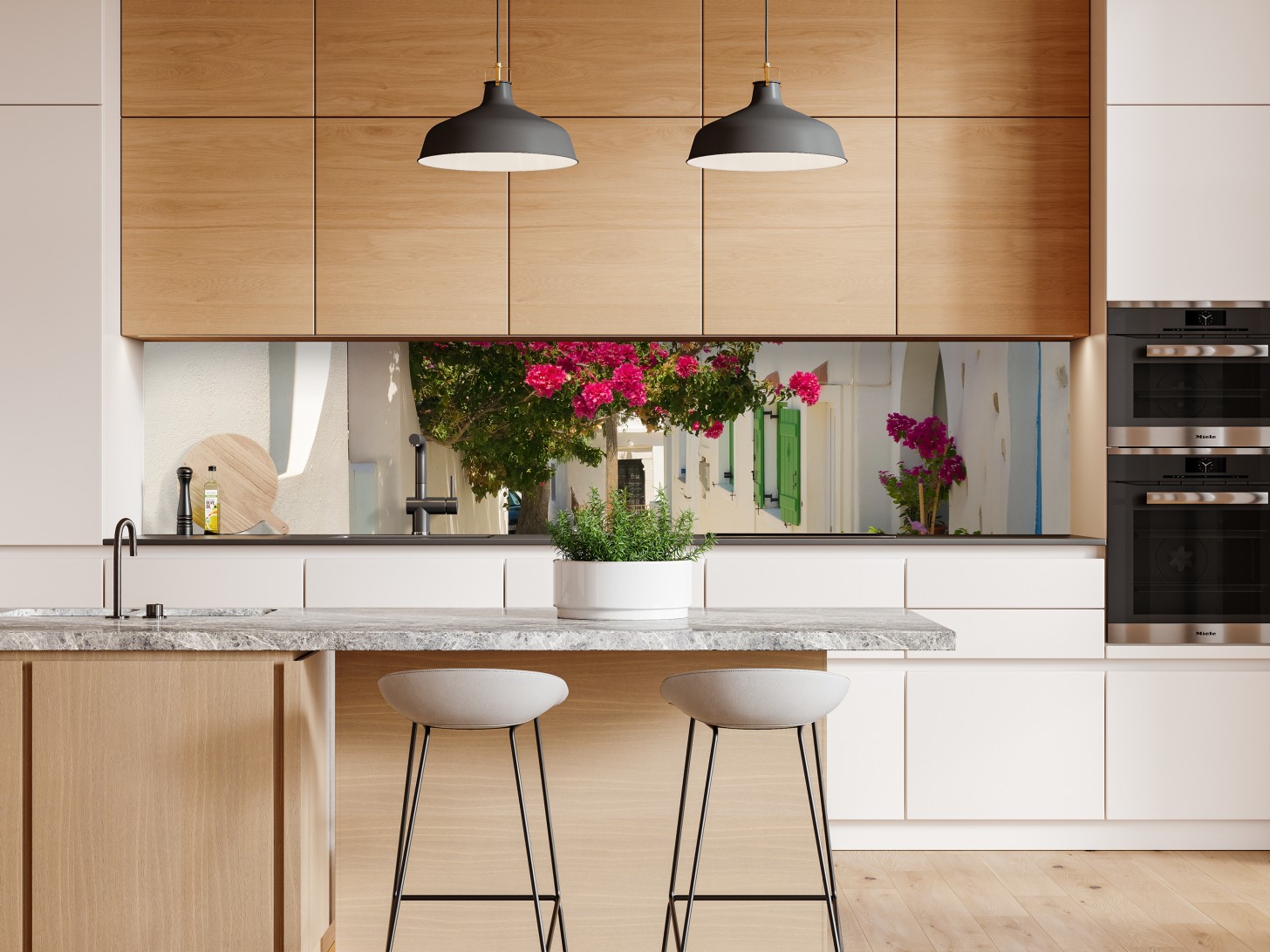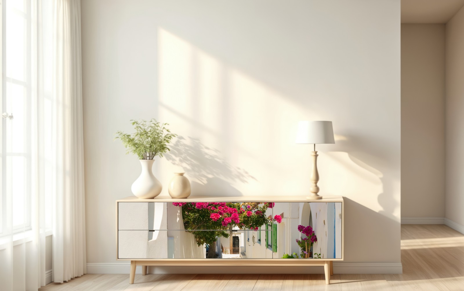 Repositionierbarer Aufkleber Sonnige mediterrane gasse mit bougainvillea