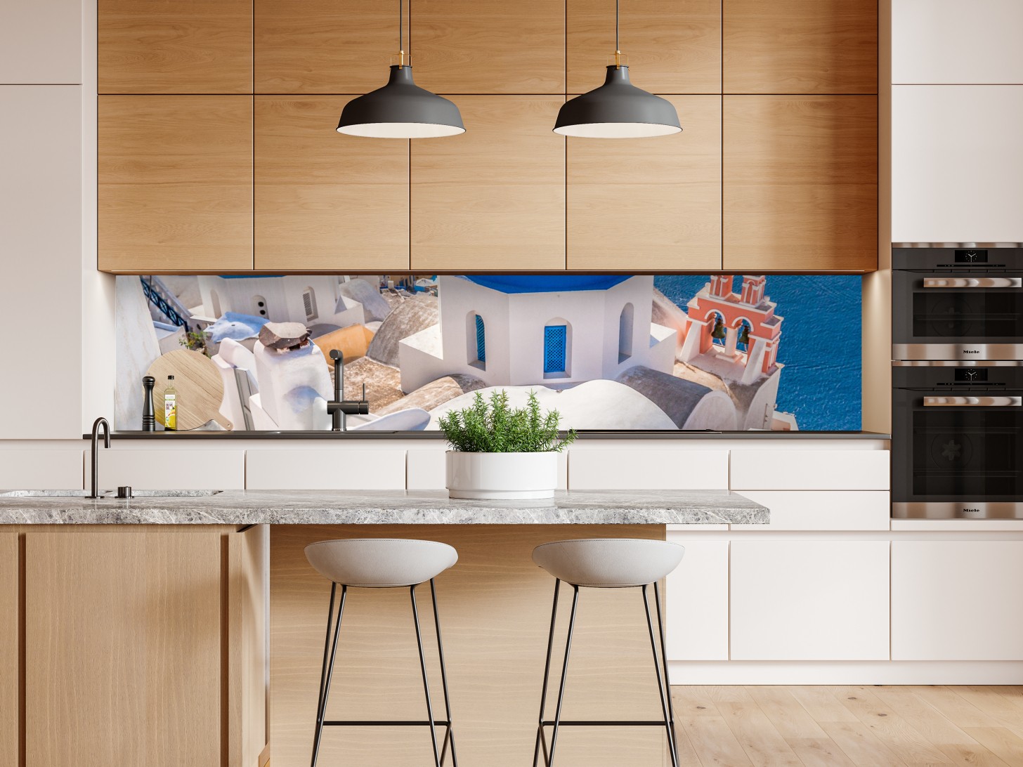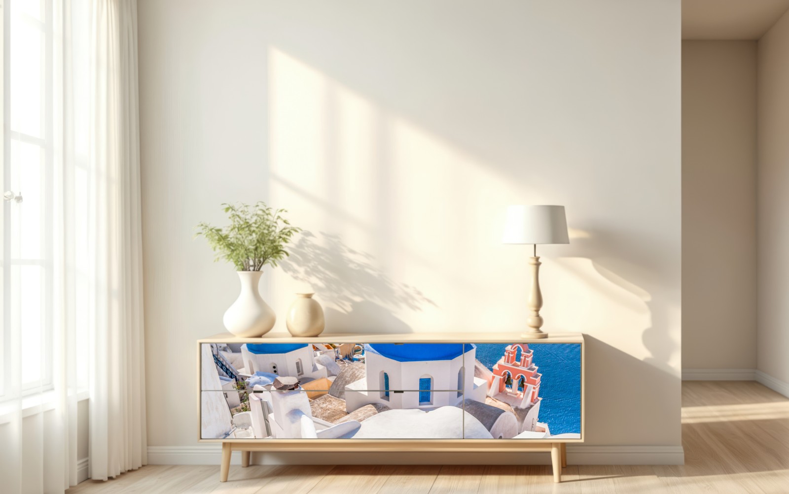 Repositionierbarer Aufkleber Sonniges Santorini blaue kuppeln und meerblick
