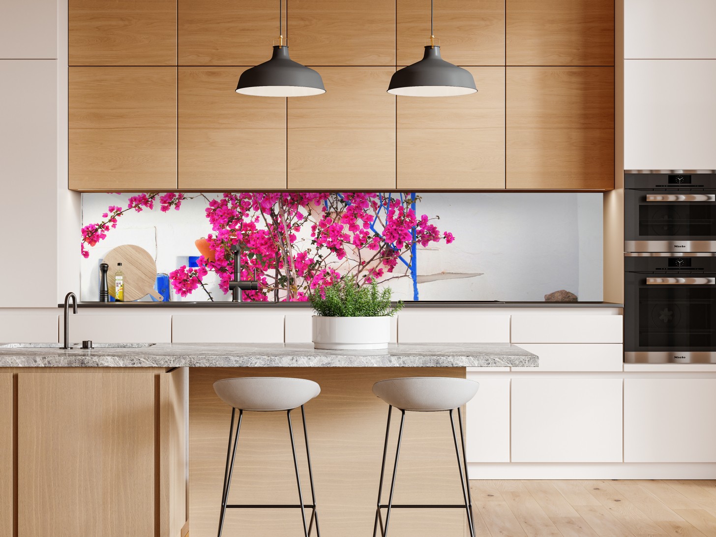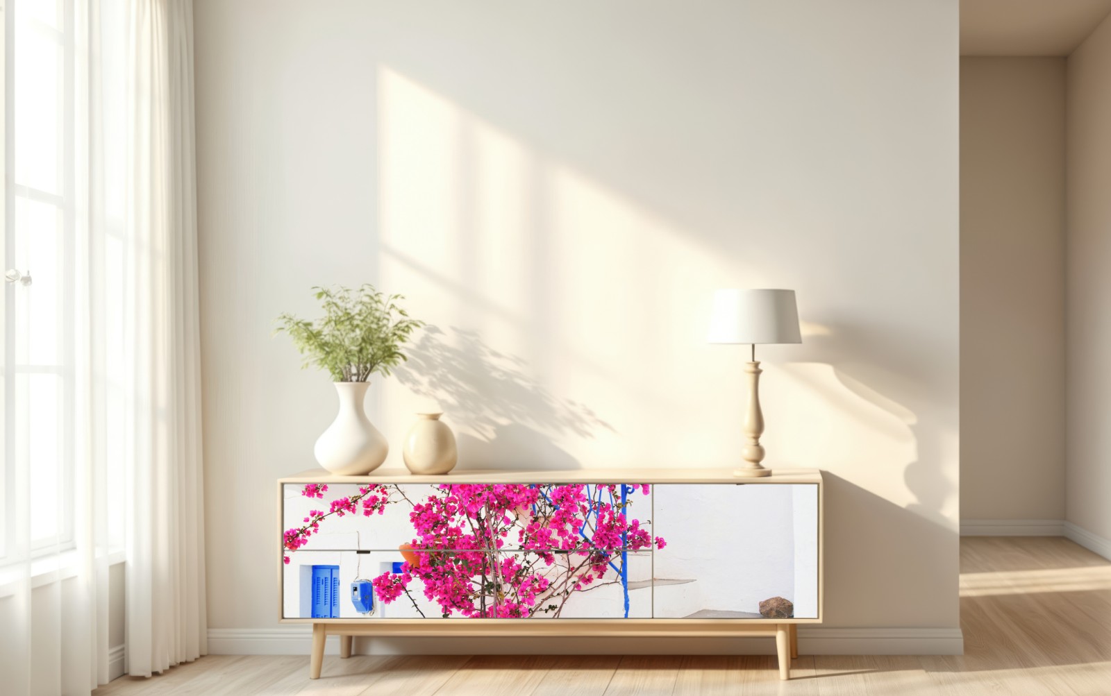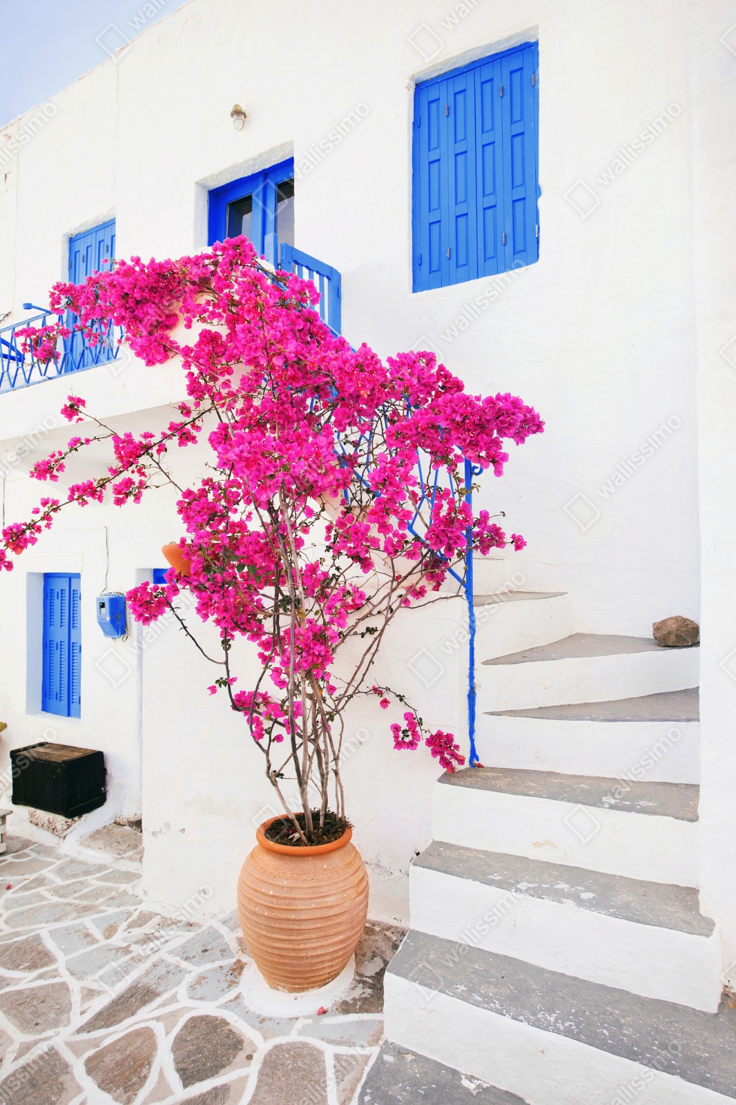 Repositionierbarer Aufkleber Rosa bougainvillea vor weißem haus auf griechischer insel