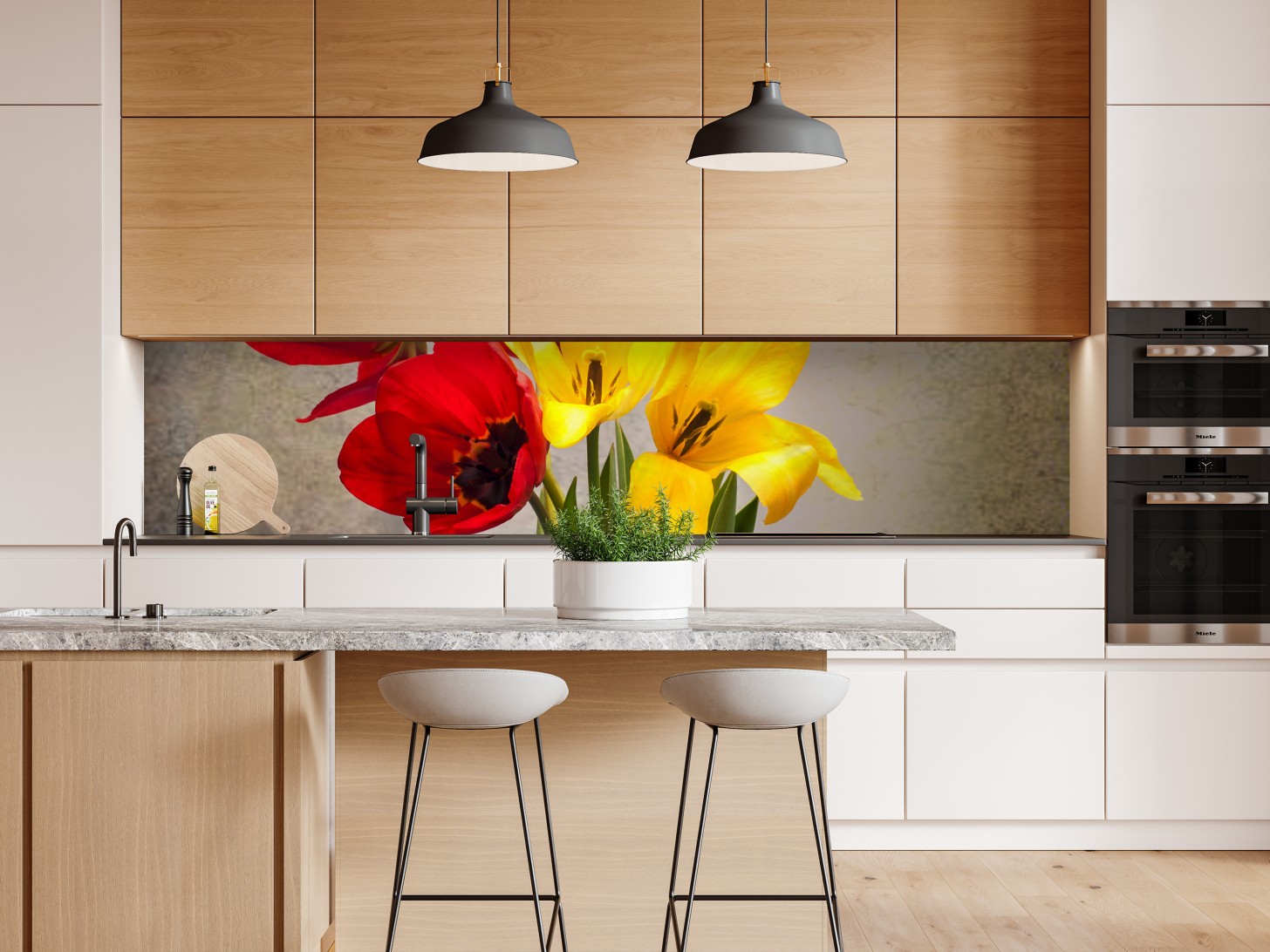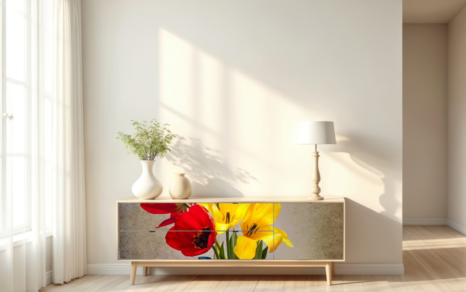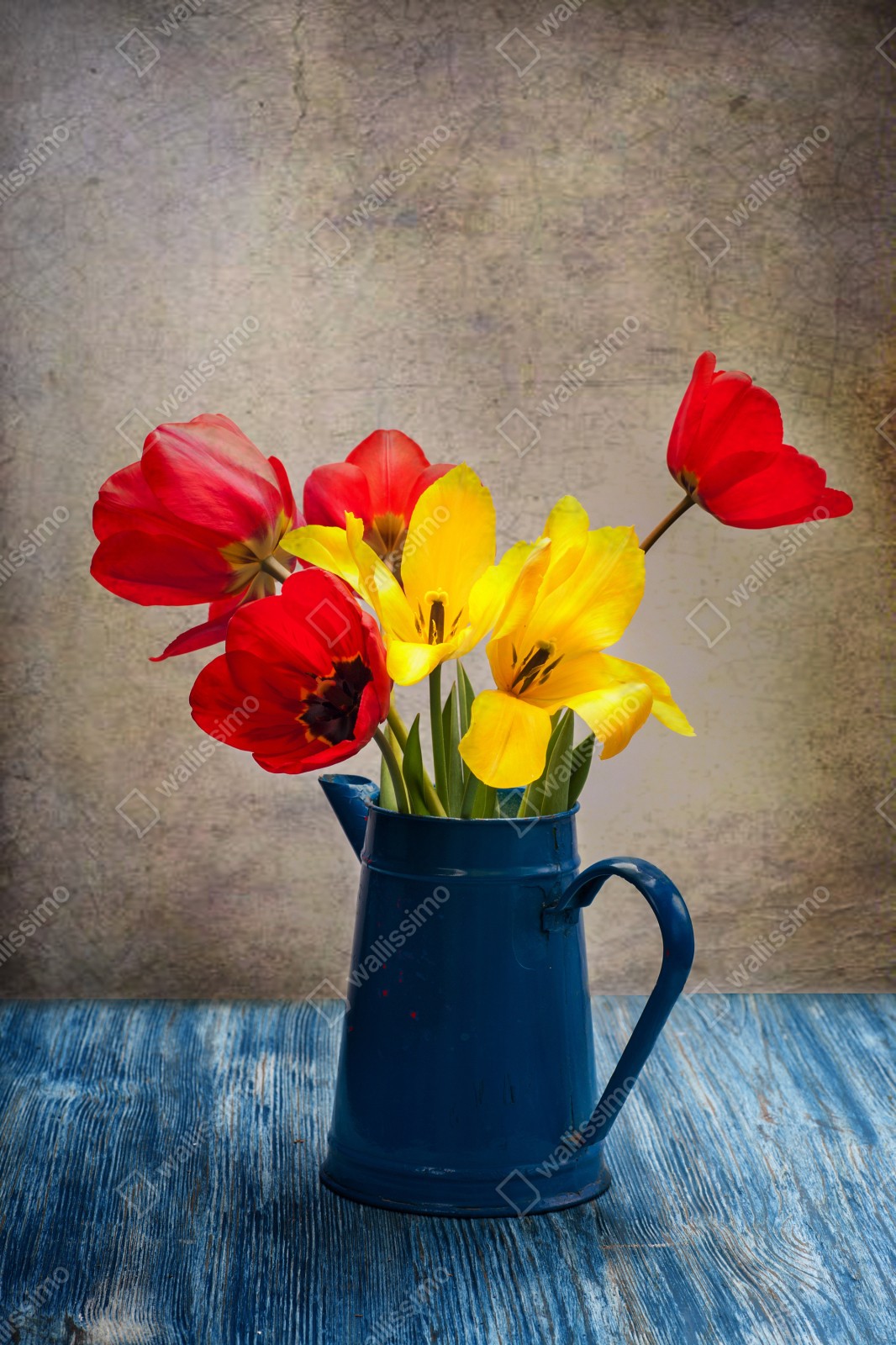 Repositionierbarer Aufkleber Bunter tulpenstrauß im blauen krug