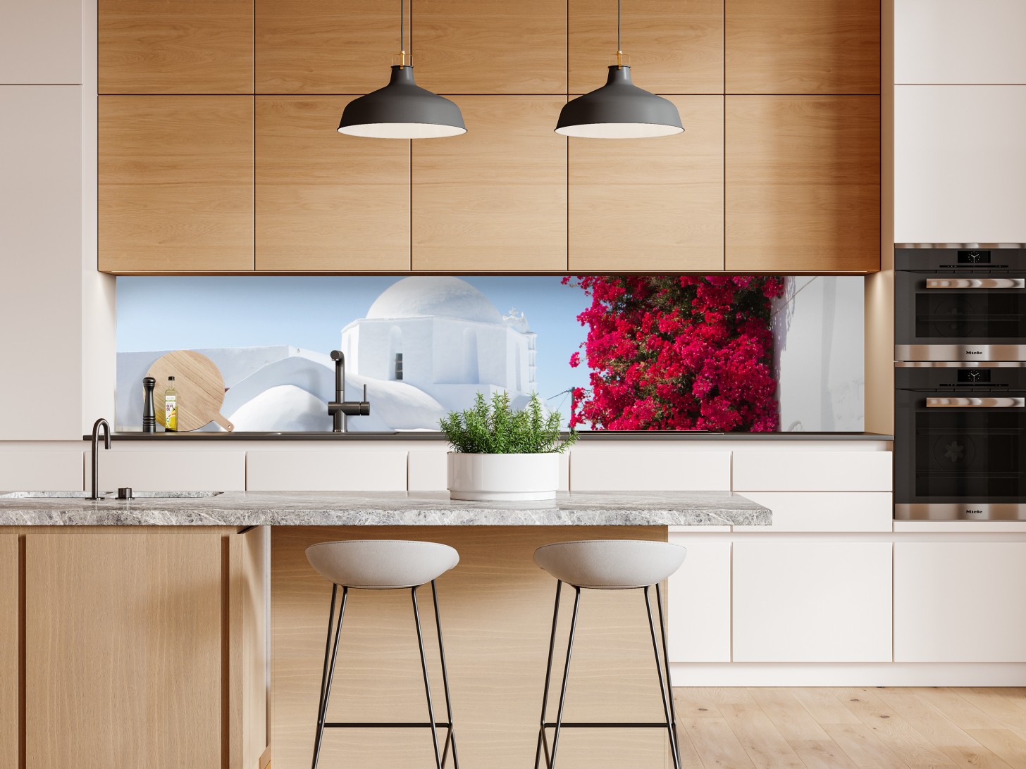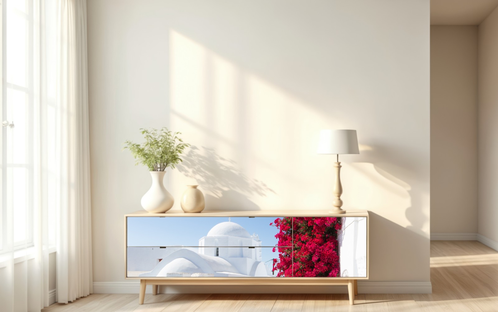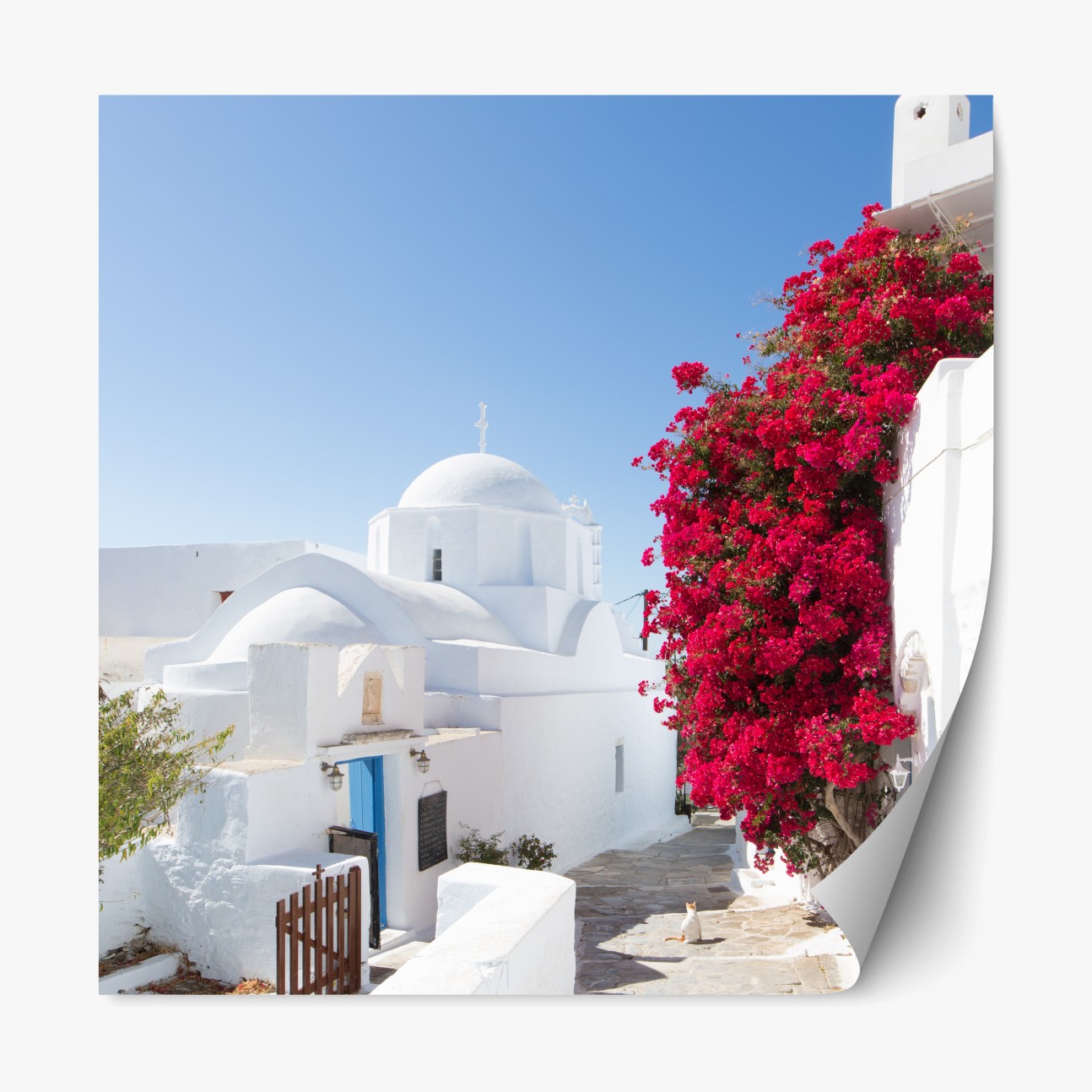 Repositionierbarer Aufkleber Sonnige gasse auf der insel mit leuchtender buganvillea
