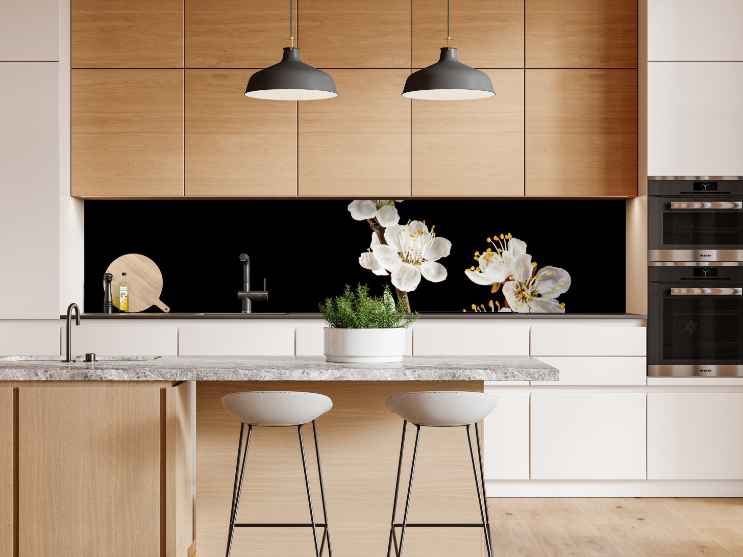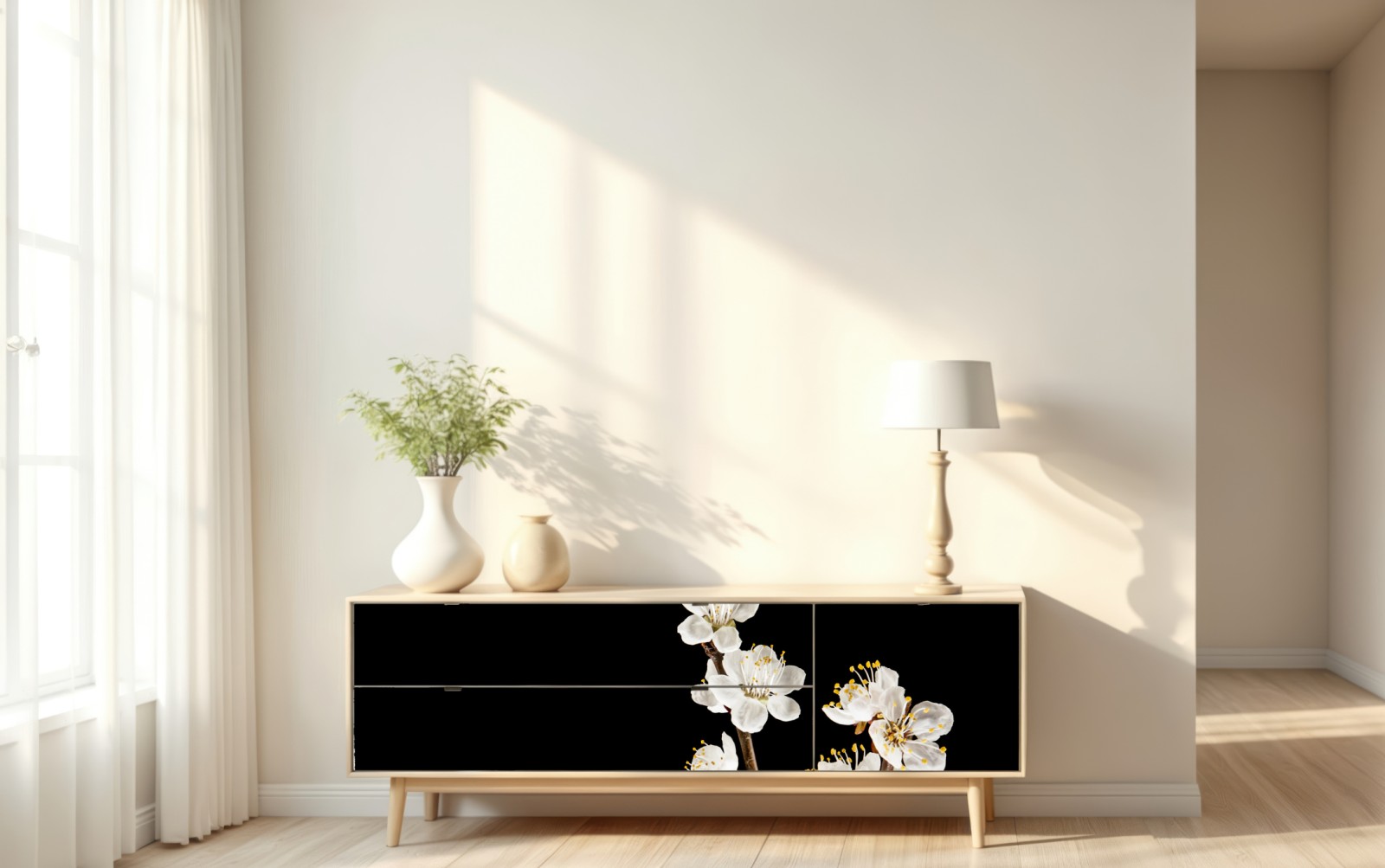 Repositionierbarer Aufkleber Zarter zweig mit aprikosenblüten auf schwarzem hintergrund