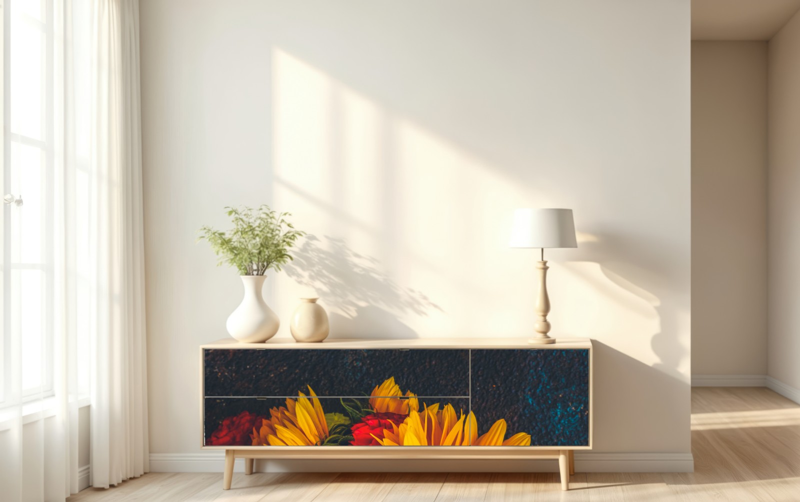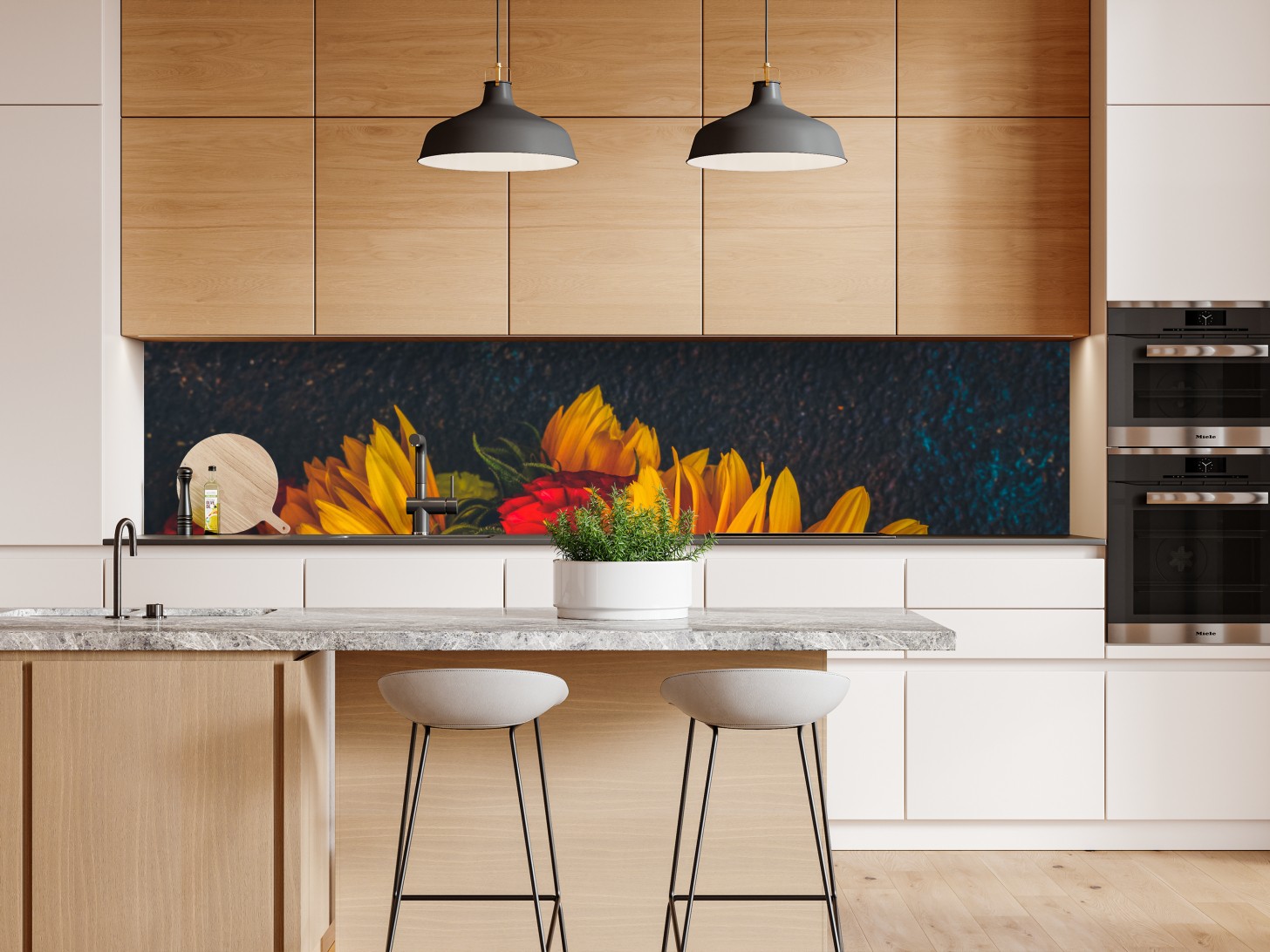 Repositionierbarer Aufkleber Lebendiger sonnenblumenstrauß vor dunklem hintergrund