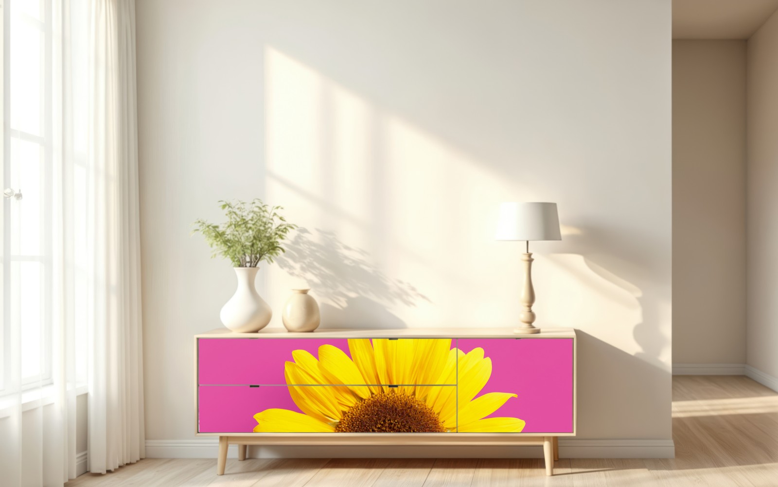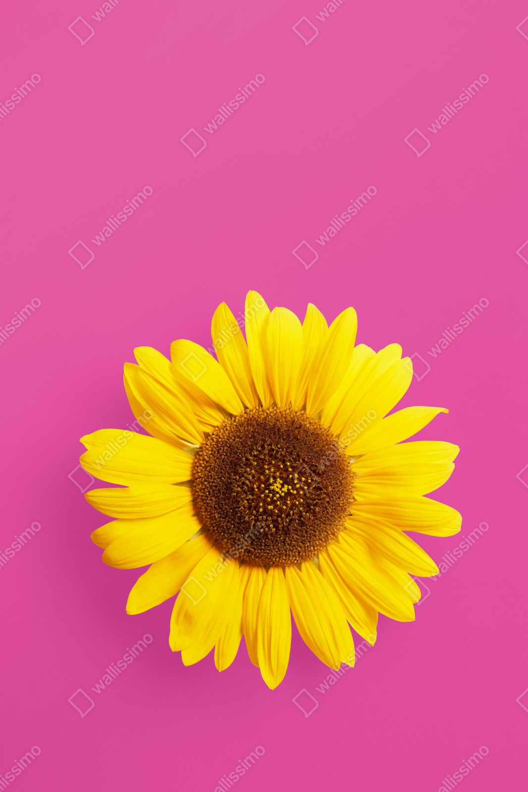 Repositionierbarer Aufkleber Leuchtende sonnenblume auf rosa hintergrund