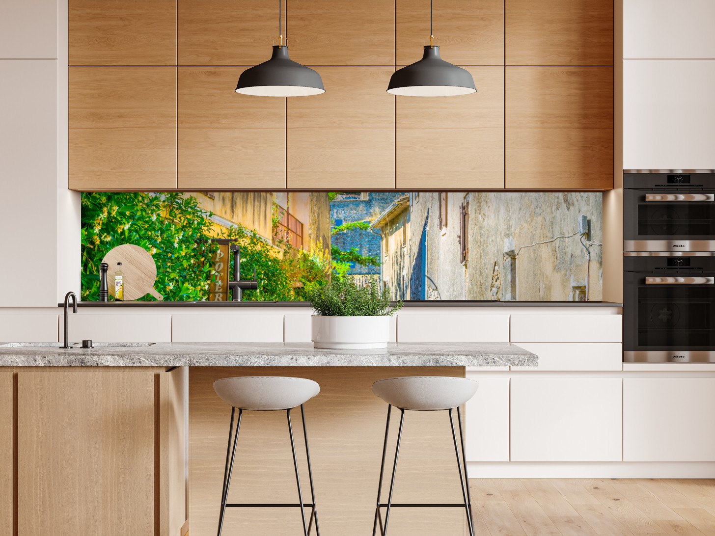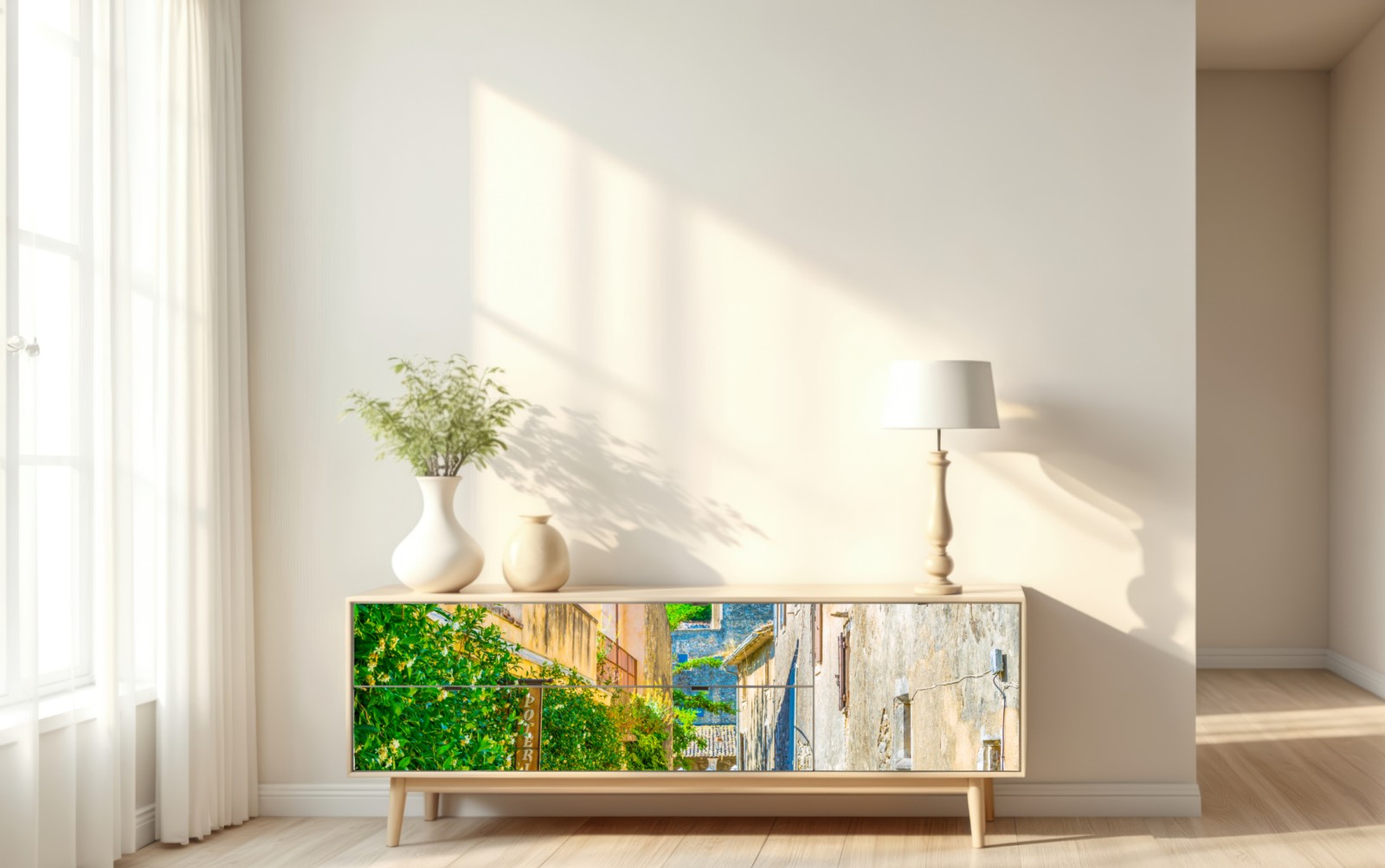 Repositionierbarer Aufkleber Sonnenbeschienene gasse in einem mediterranen dorf