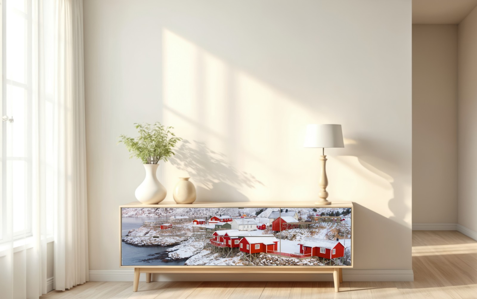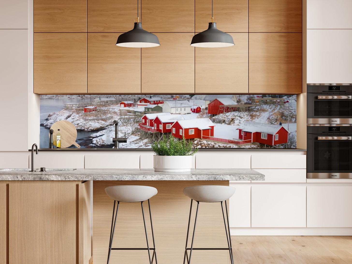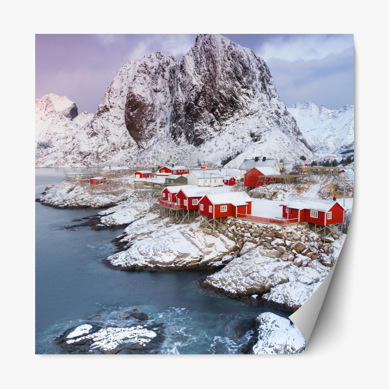 Repositionierbarer Aufkleber Rote küstenhäuser vor schneebedecktem berg