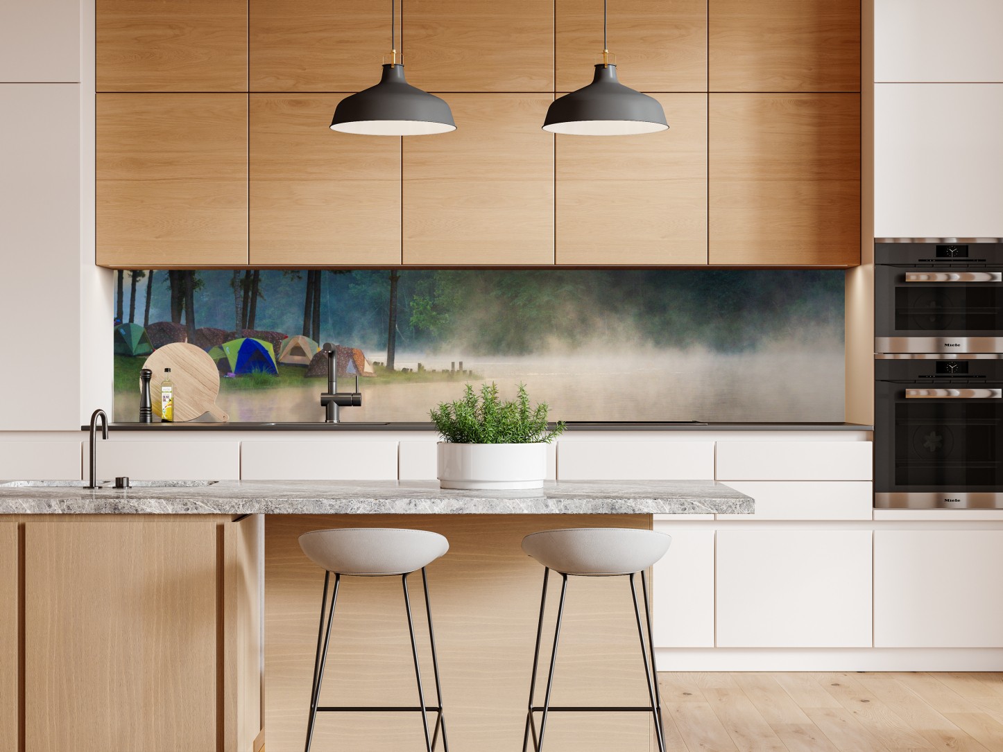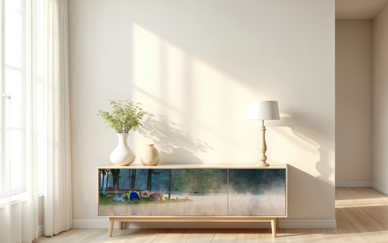 Repositionierbarer Aufkleber Morgendlicher nebel am Pang Oung see, Mae Hong Son