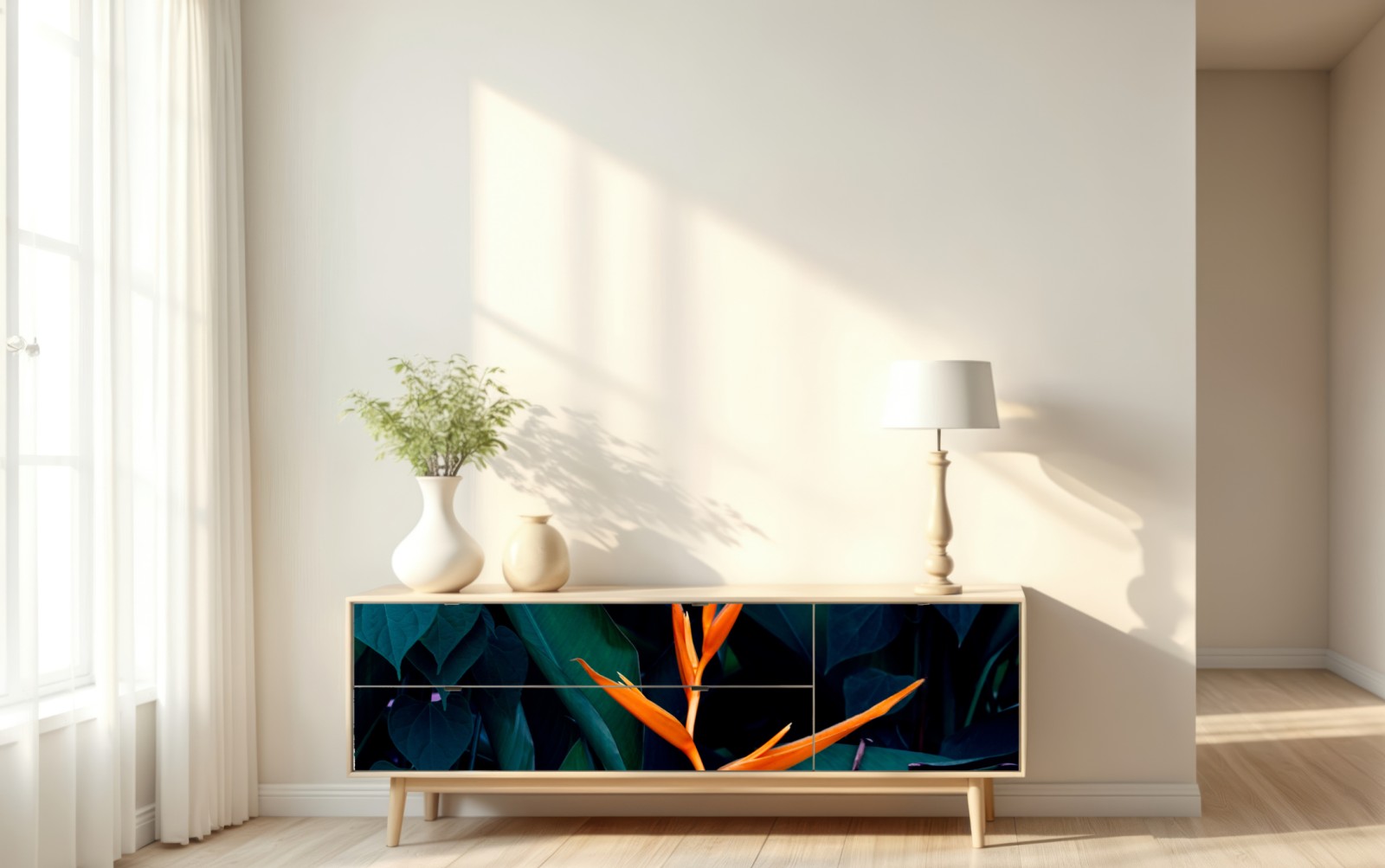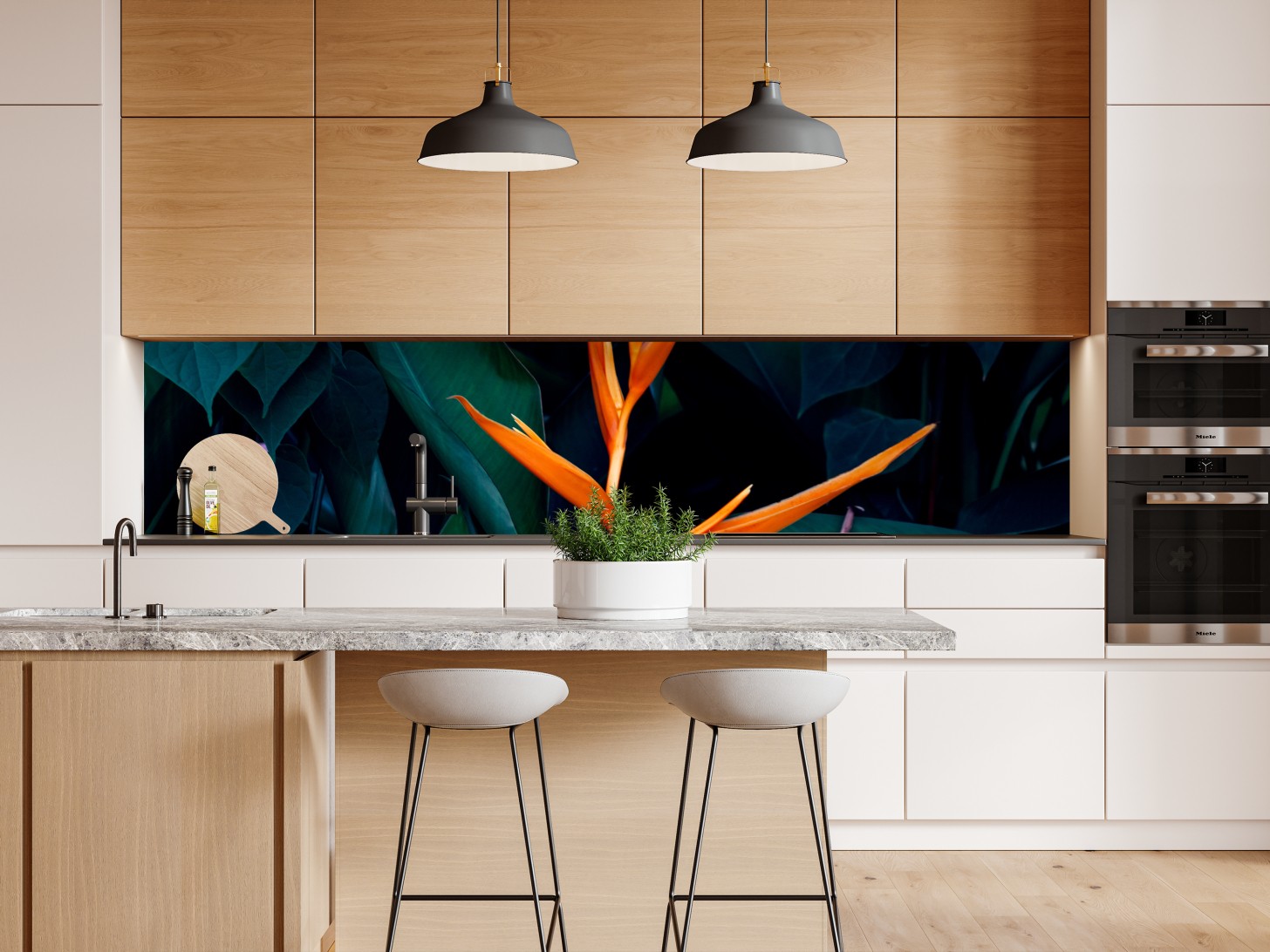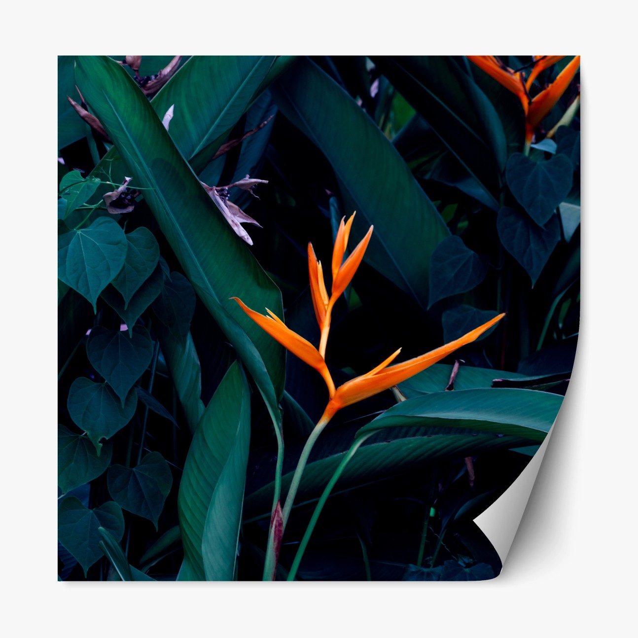 Repositionierbarer Aufkleber Leuchtende strelitzie vor tiefgrünen blättern