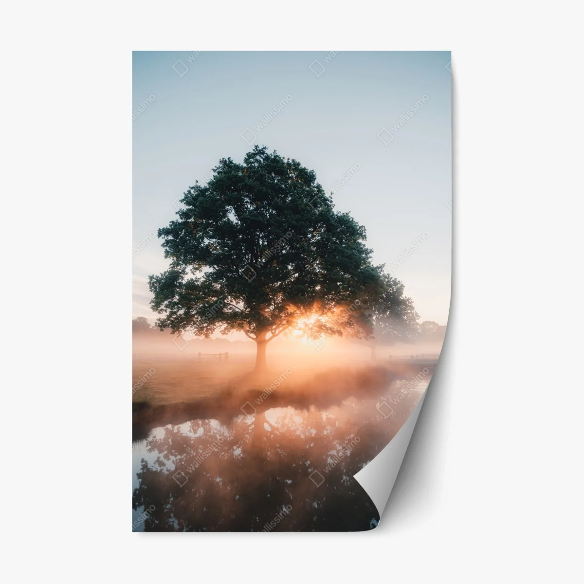Repositionierbarer Aufkleber Nebeliger sonnenaufgang am eichenbaum