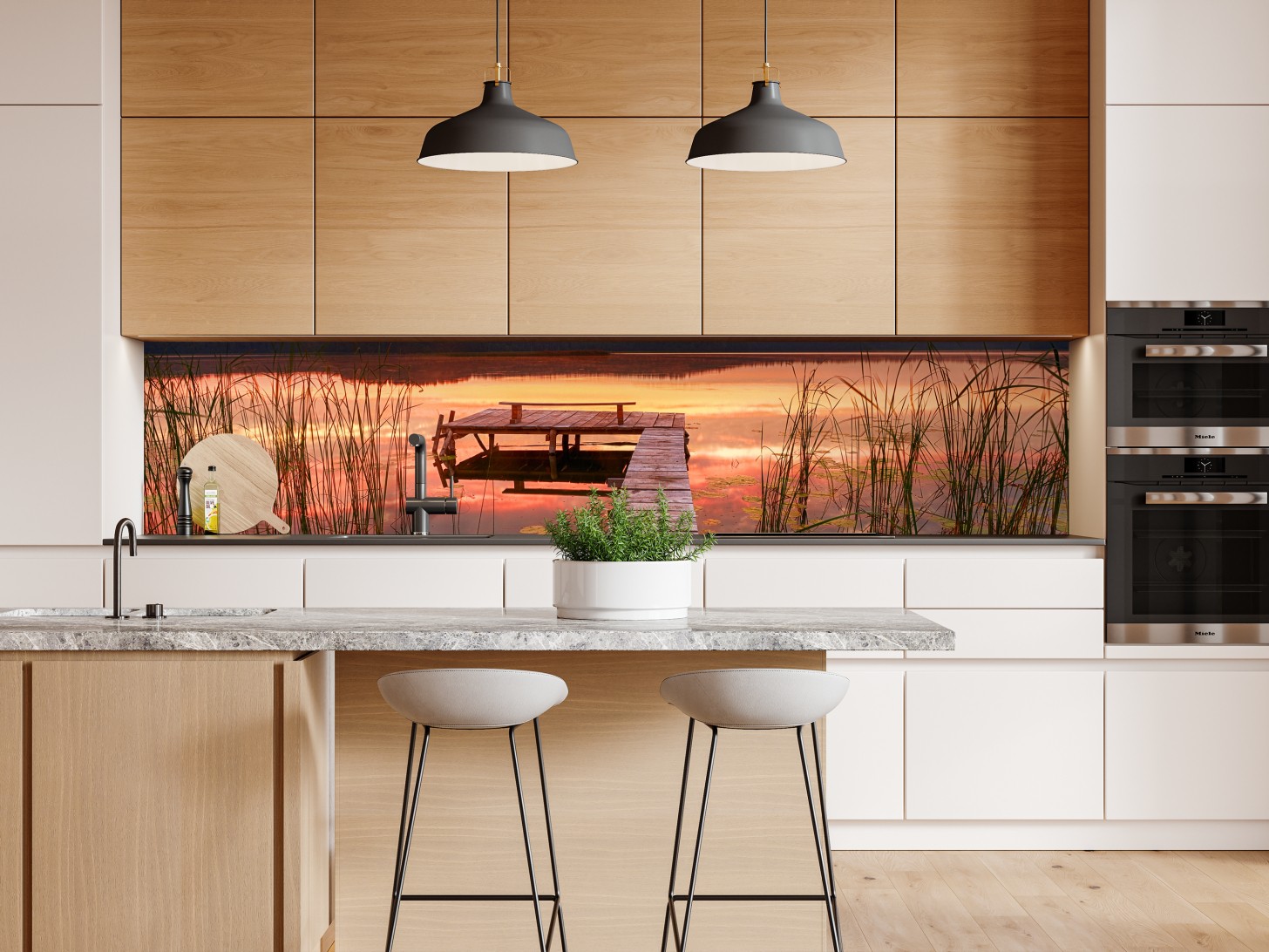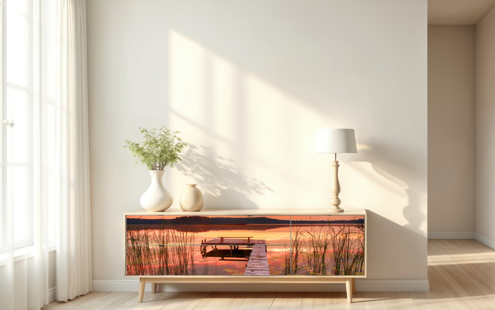 Repositionierbarer Aufkleber Sonnenaufgang über ruhigem see mit steg