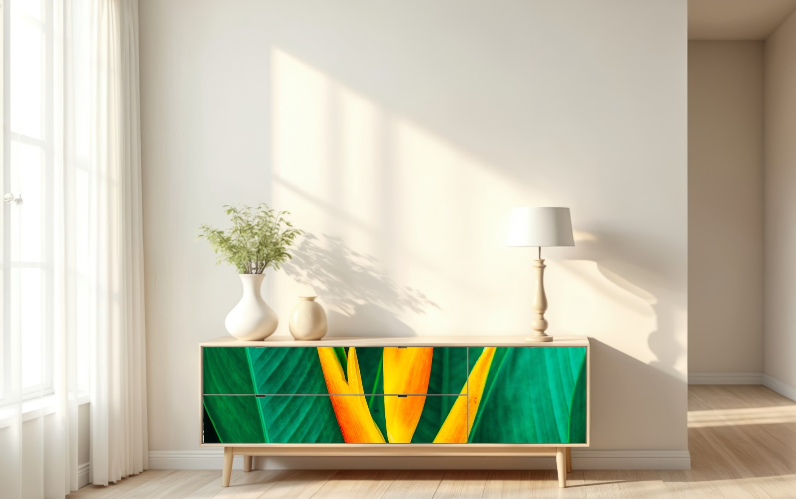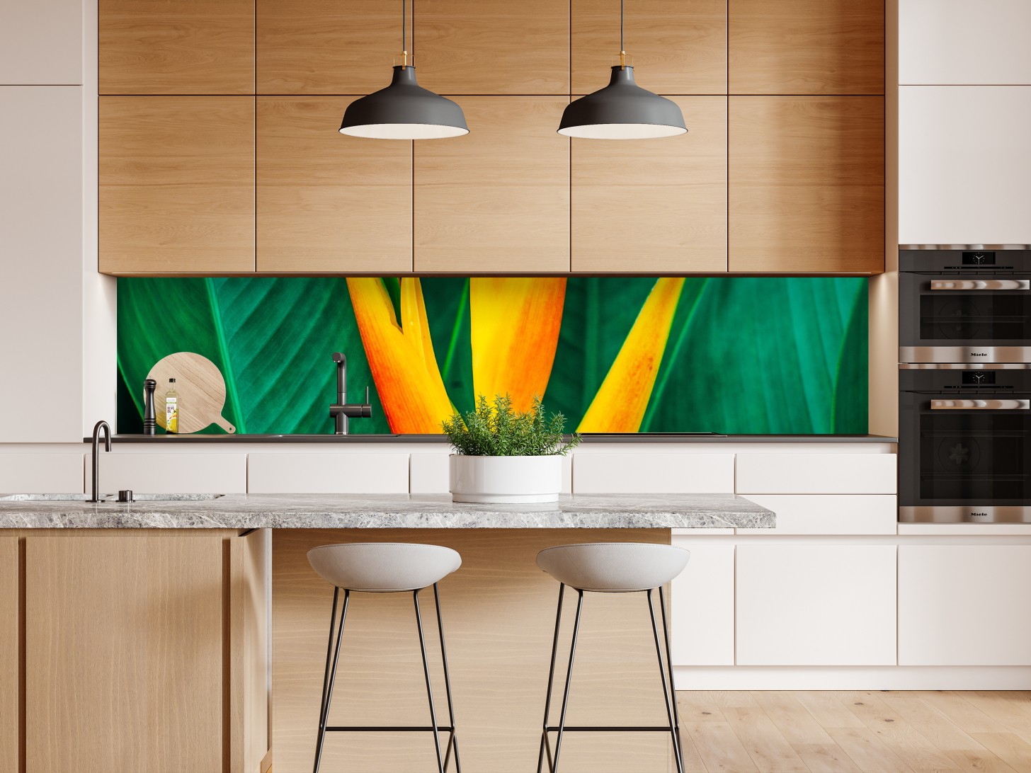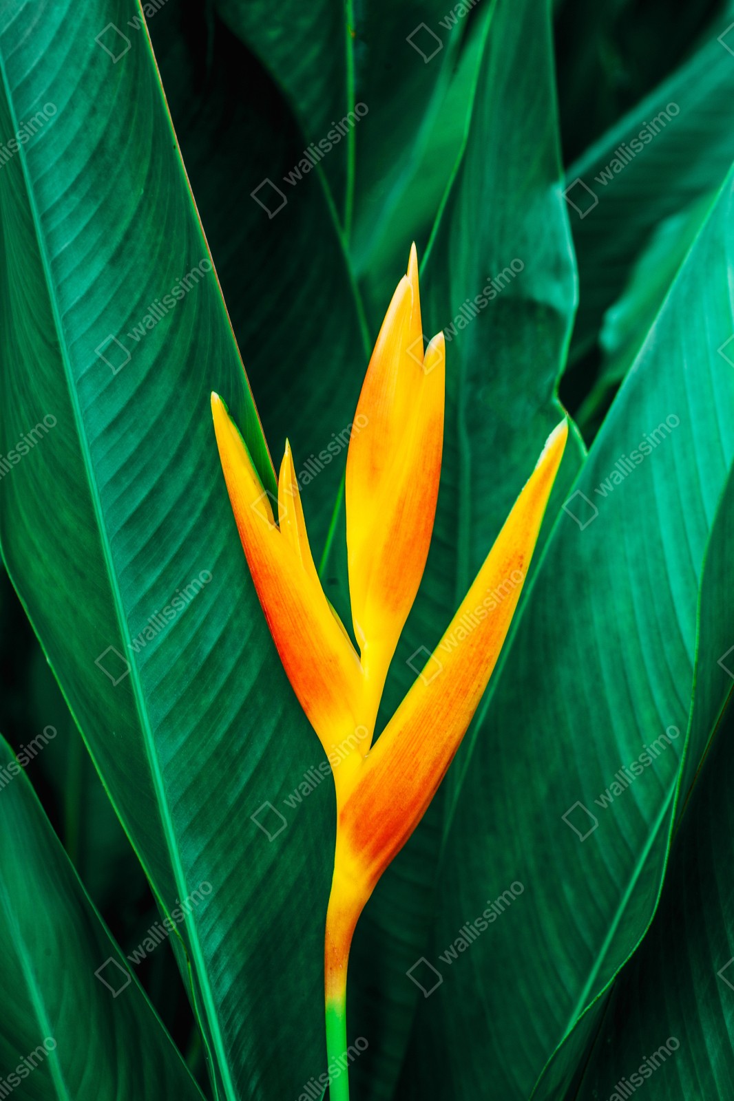 Repositionierbarer Aufkleber Leuchtende tropische heliconia vor satten grünen blättern