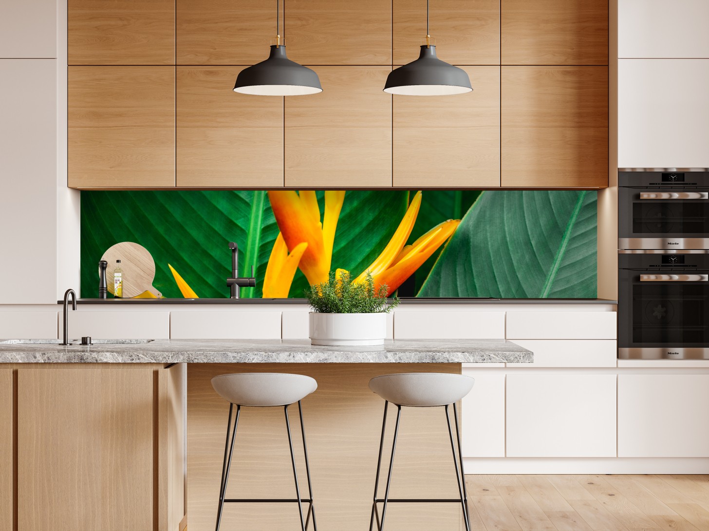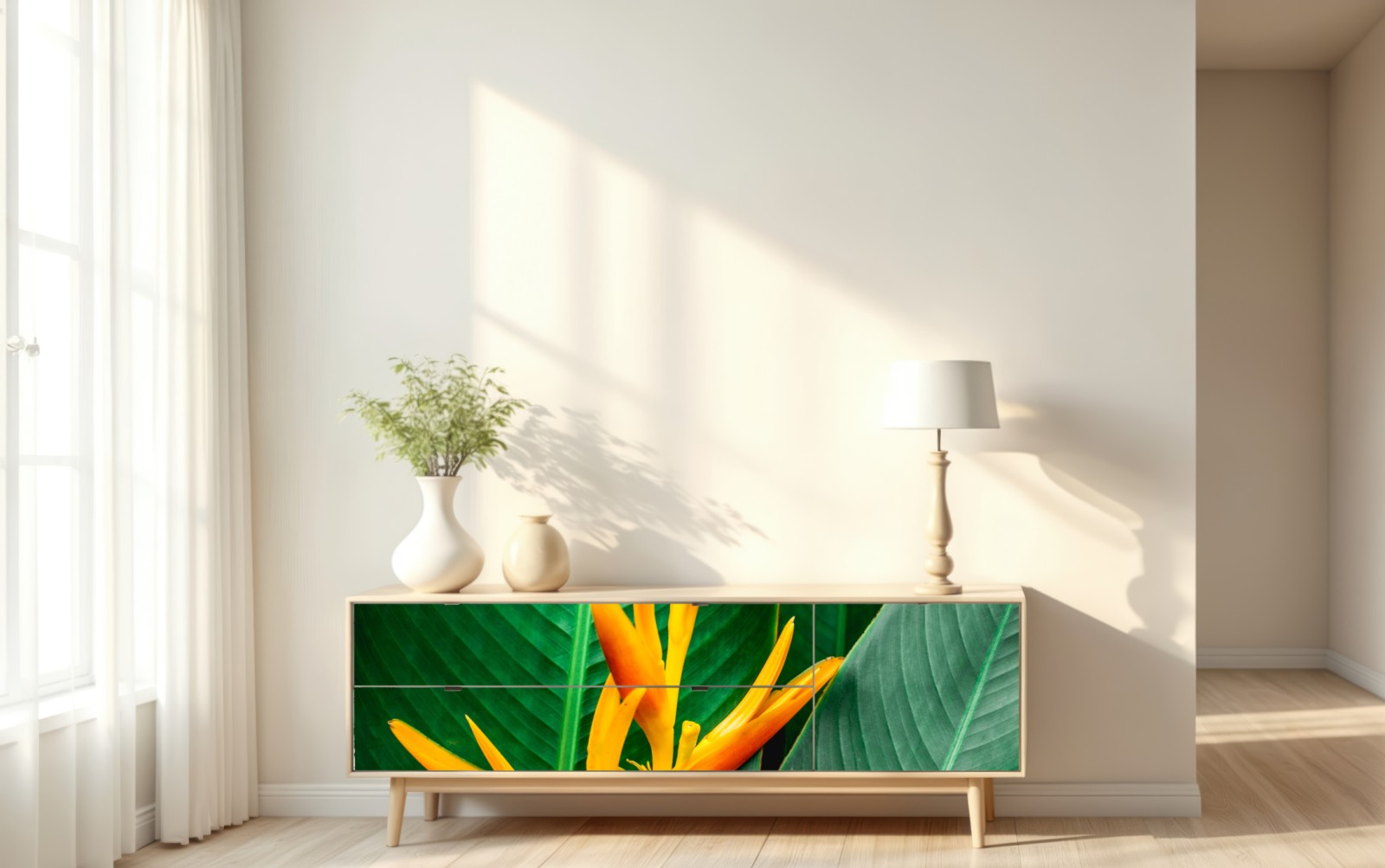 Repositionierbarer Aufkleber Leuchtende heliconia vor grünen blättern