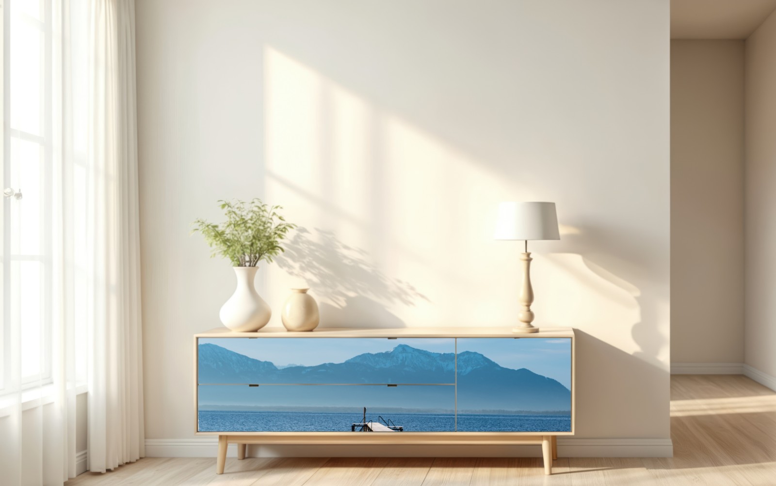 Repositionierbarer Aufkleber Nebliger steg am bergsee bei dämmerung