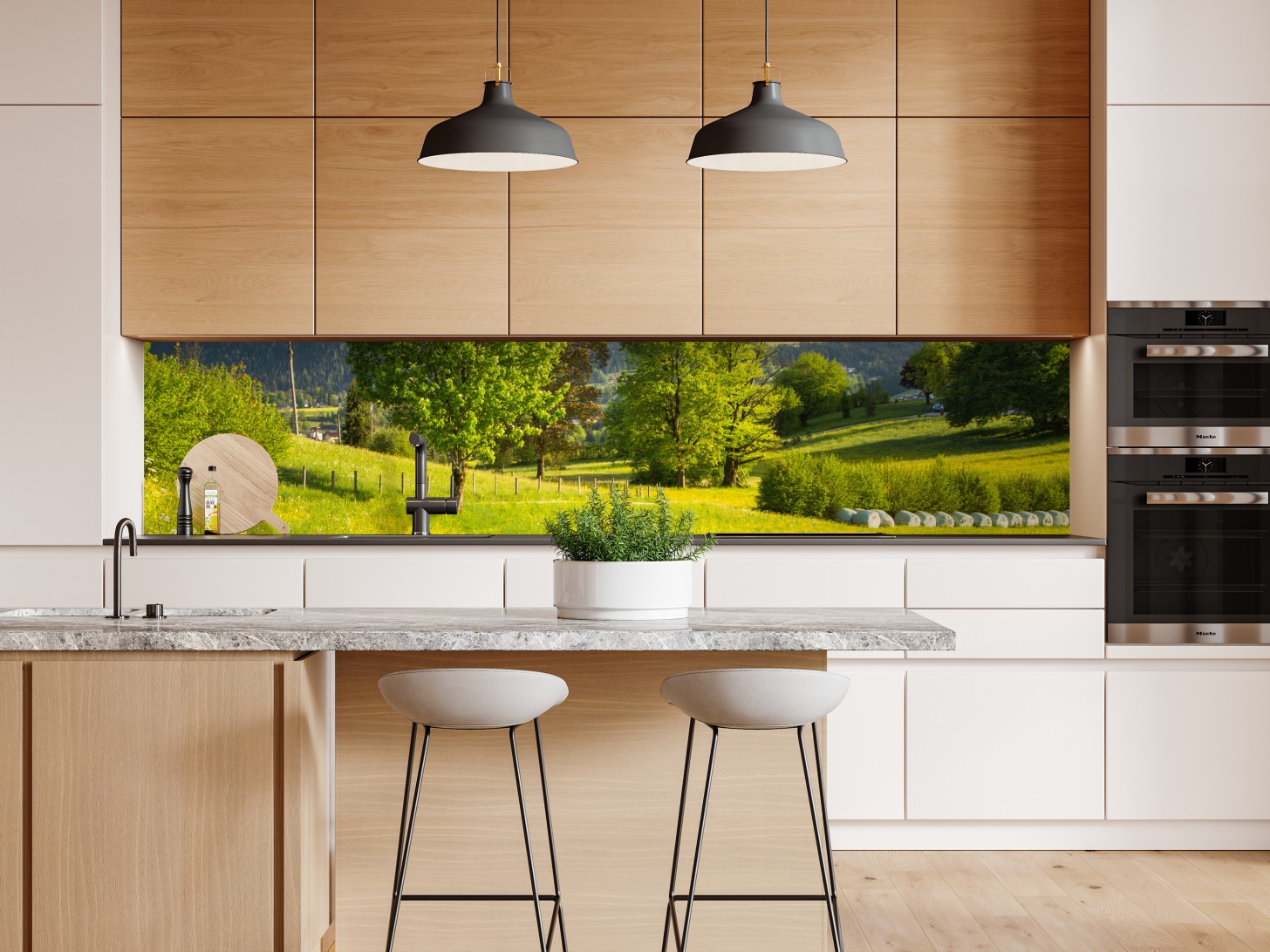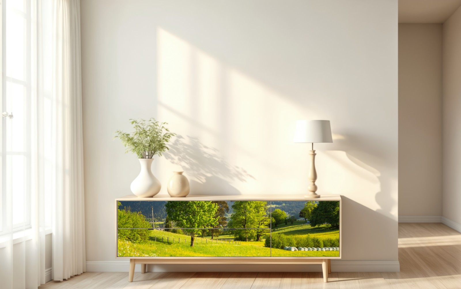 Repositionierbarer Aufkleber Alpine frühlingswiese unter schneebedeckten gipfeln