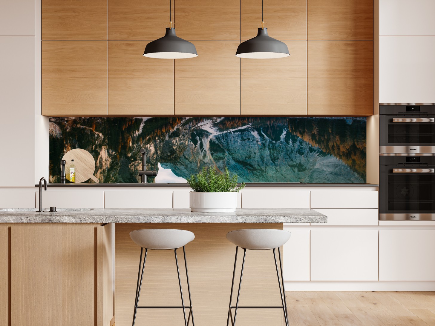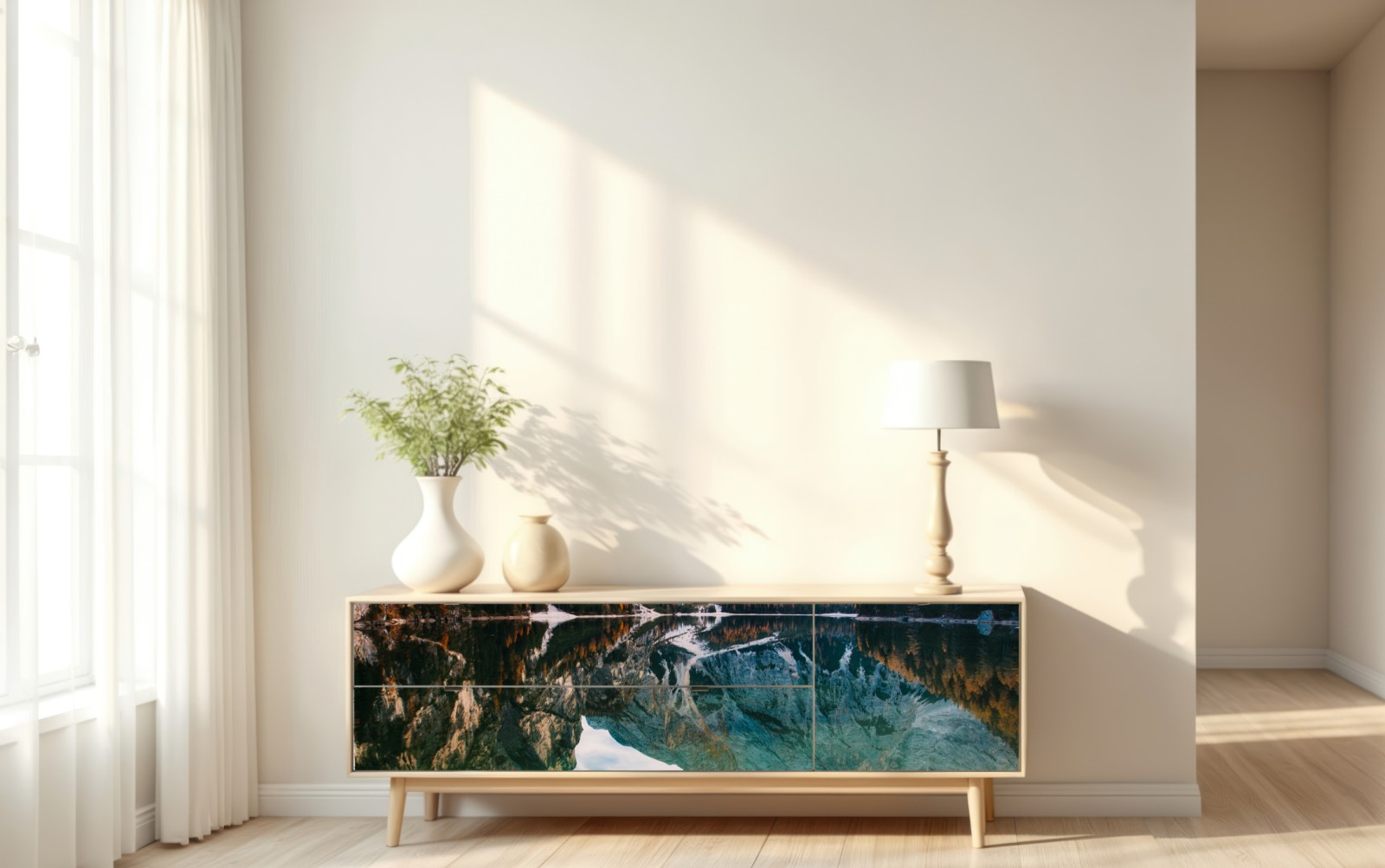Repositionierbarer Aufkleber Ruhiger alpensee mit hölzernem steg