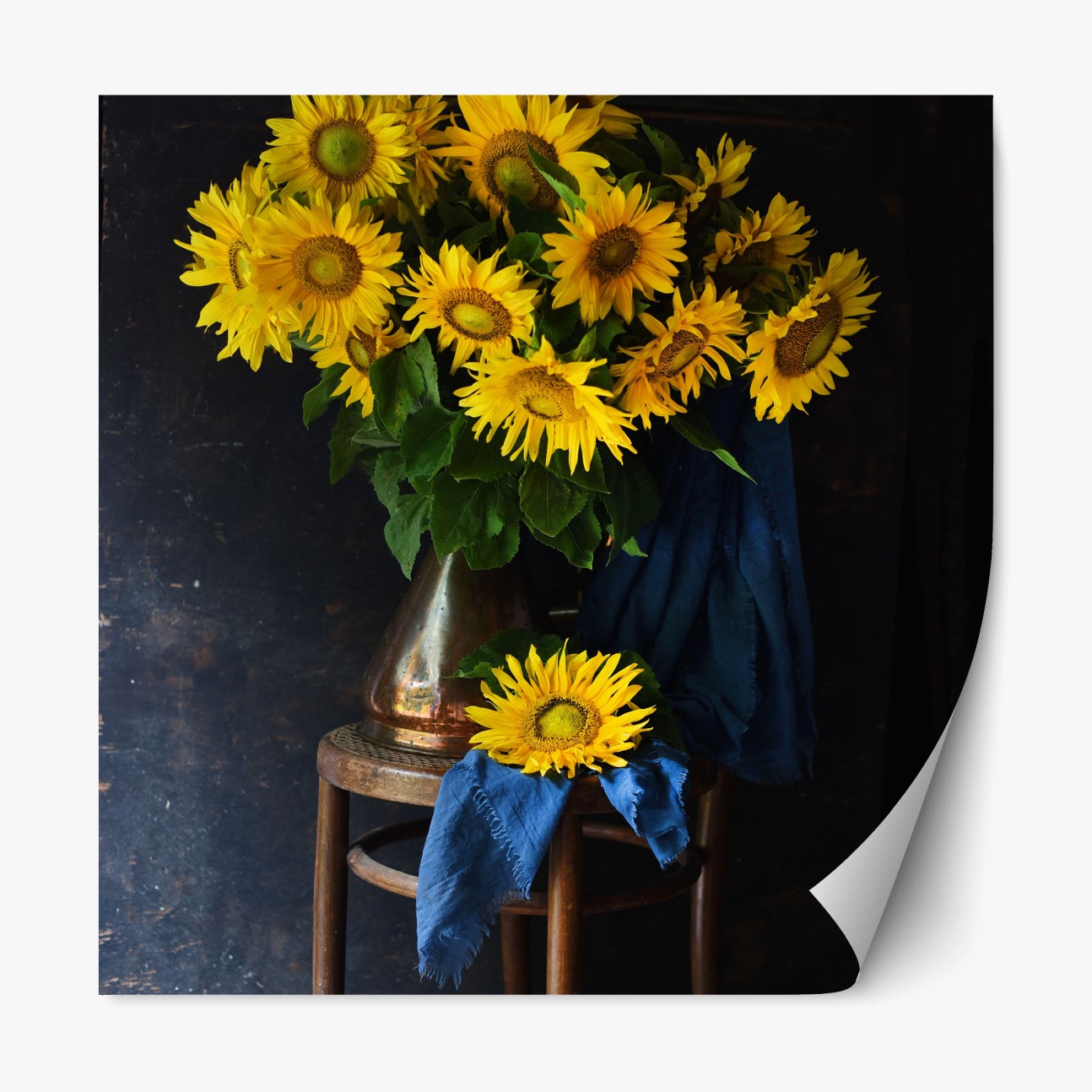 Repositionierbarer Aufkleber Leuchtender sonnenblumenstrauß auf vintage-hocker