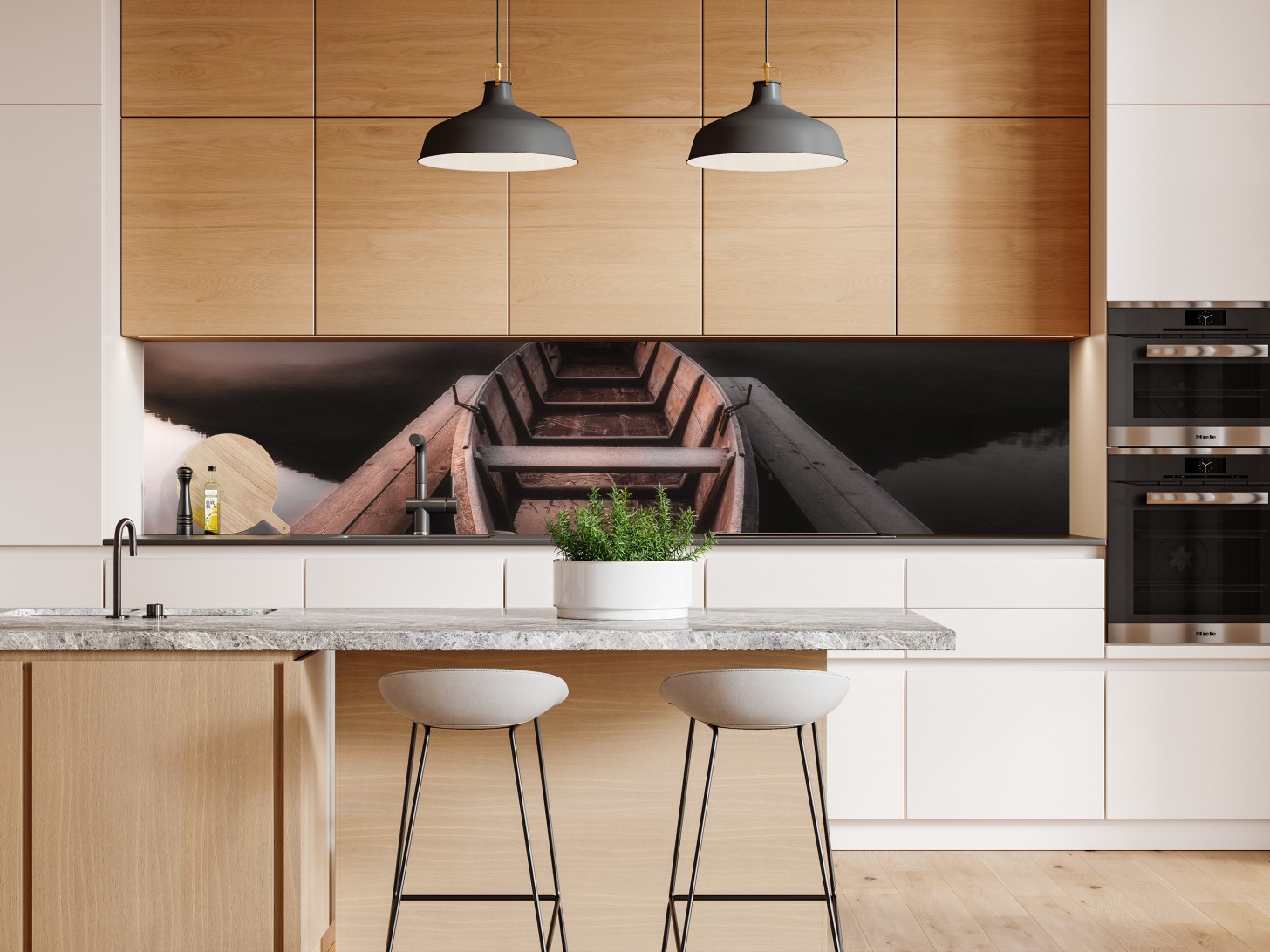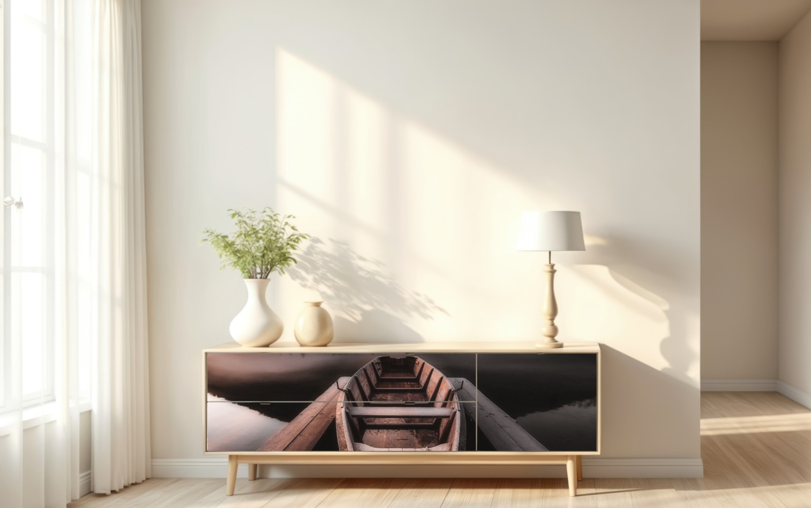 Repositionierbarer Aufkleber Nebliges boot am bergsee
