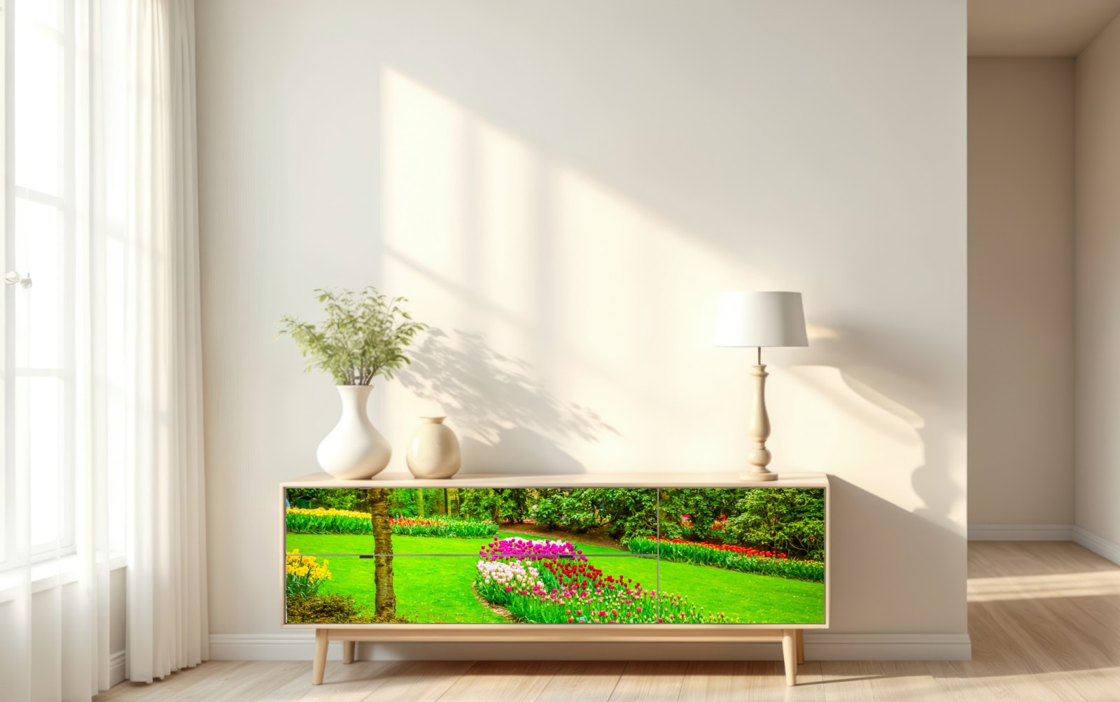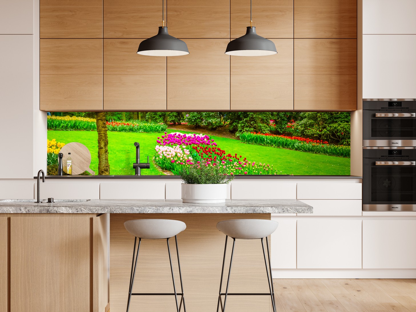 Repositionierbarer Aufkleber Frühlingsgarten in blüte: tulpen und kirschblüten