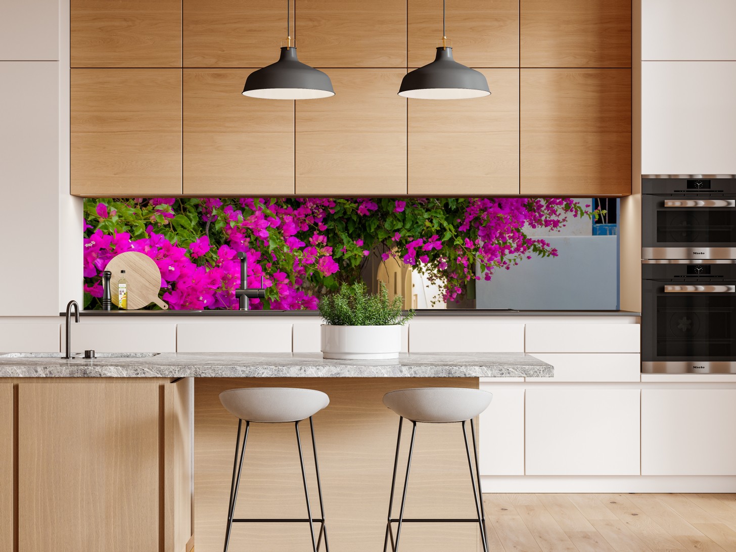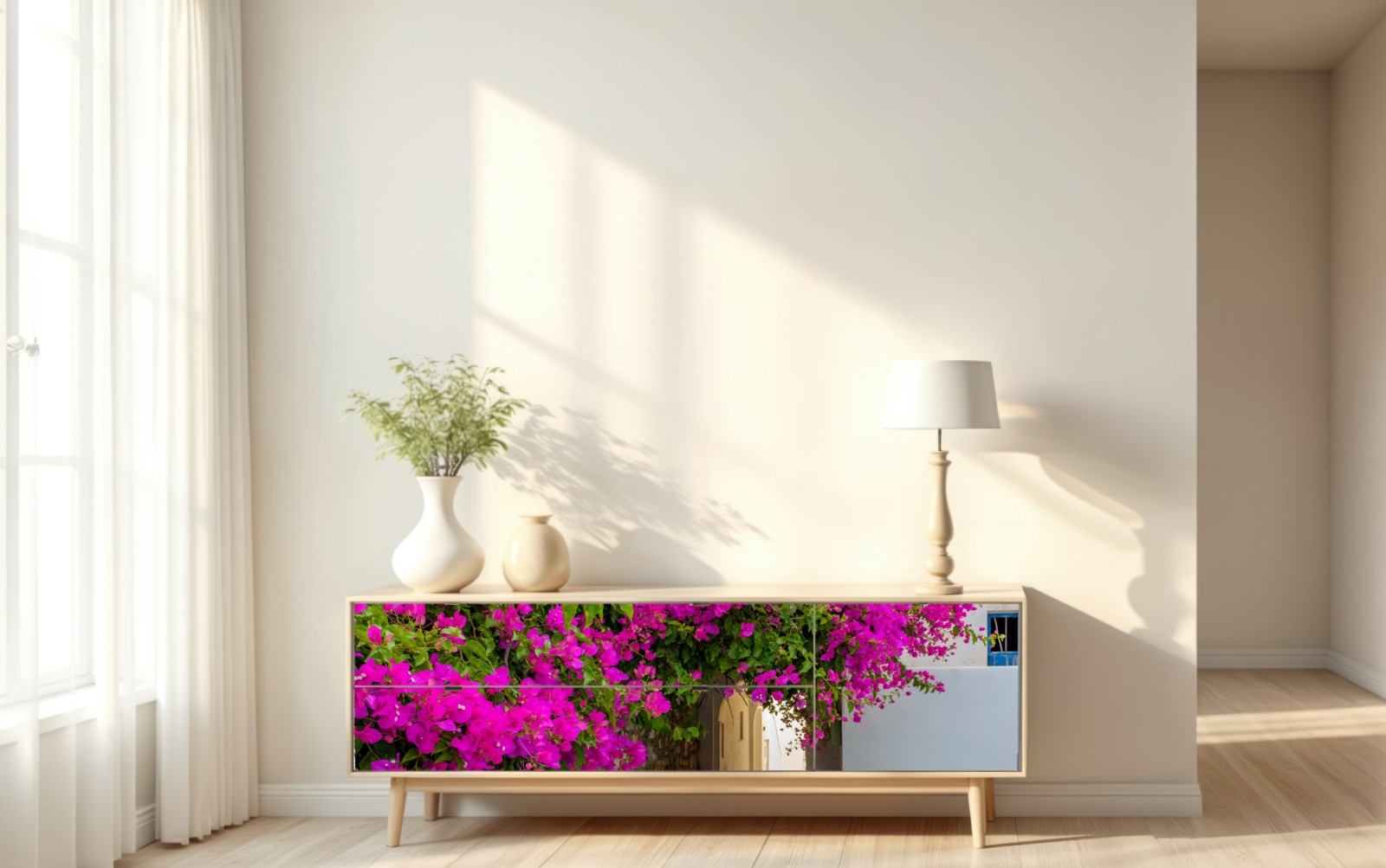 Repositionierbarer Aufkleber Blühende bougainvillea in Naousa gasse
