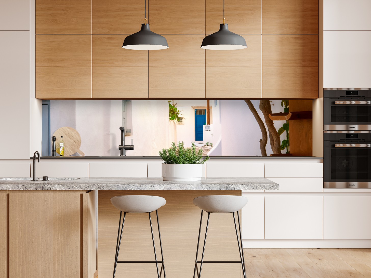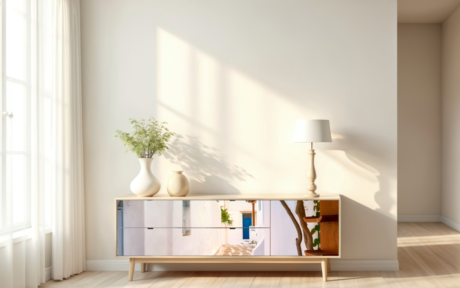Repositionierbarer Aufkleber Sonnige gasse in Griechenland mit bougainvillea
