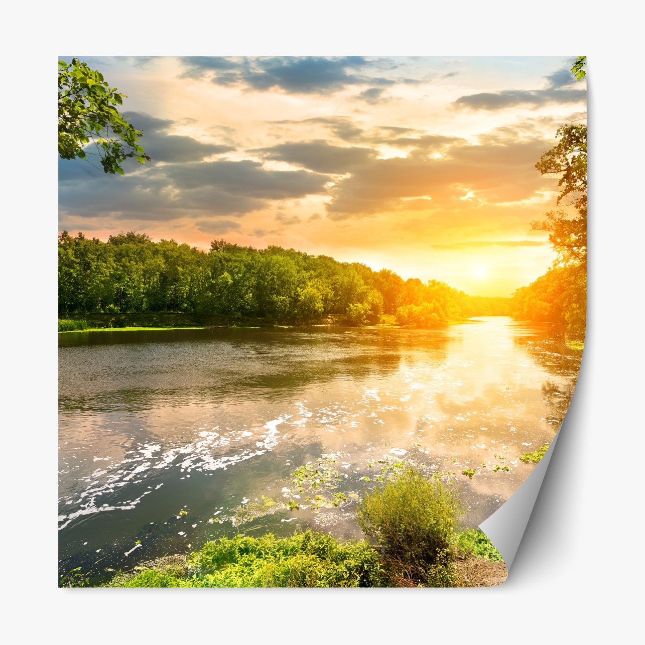 Repositionierbarer Aufkleber Ruhiger sonnenuntergang am fluss im grünen wald