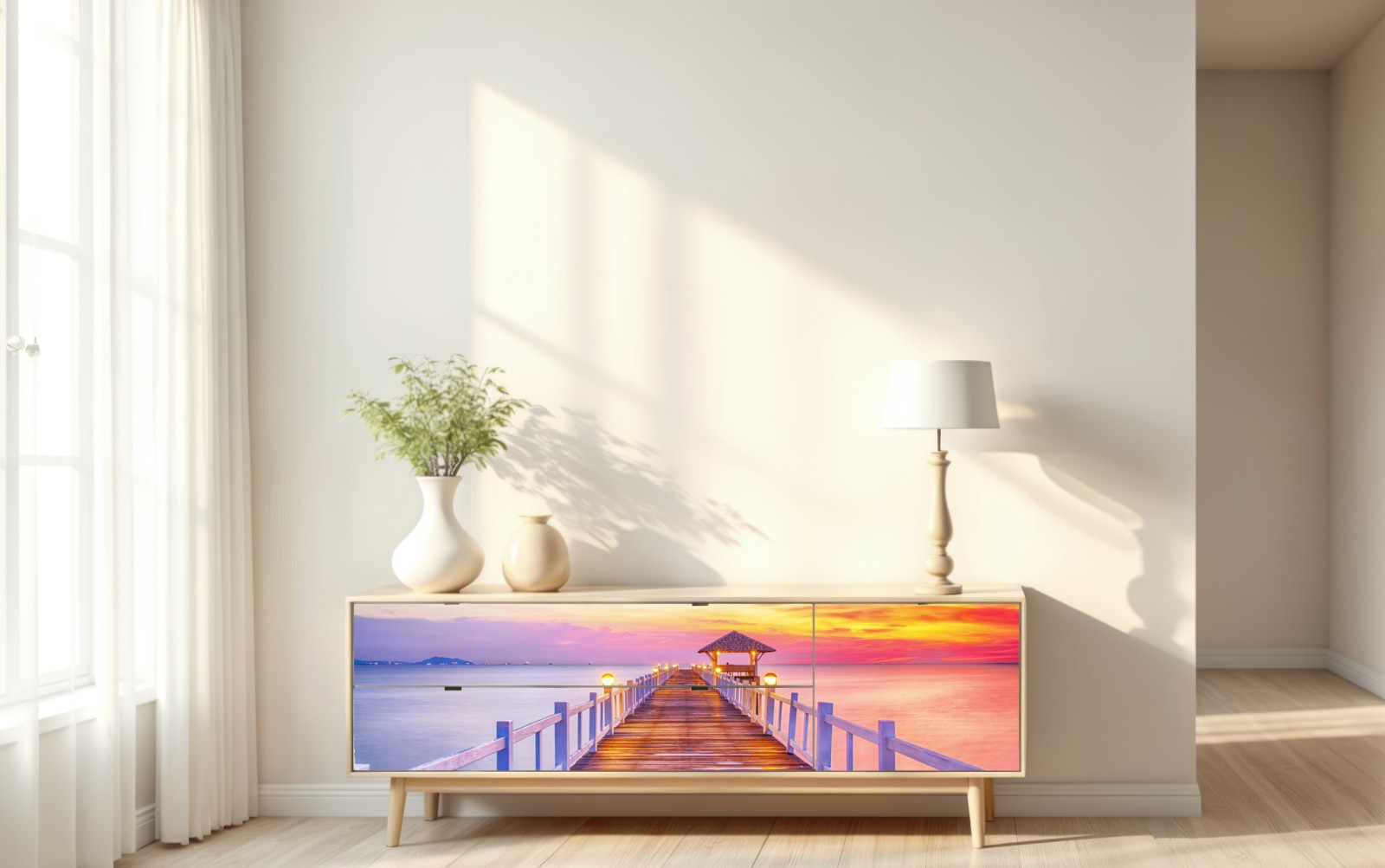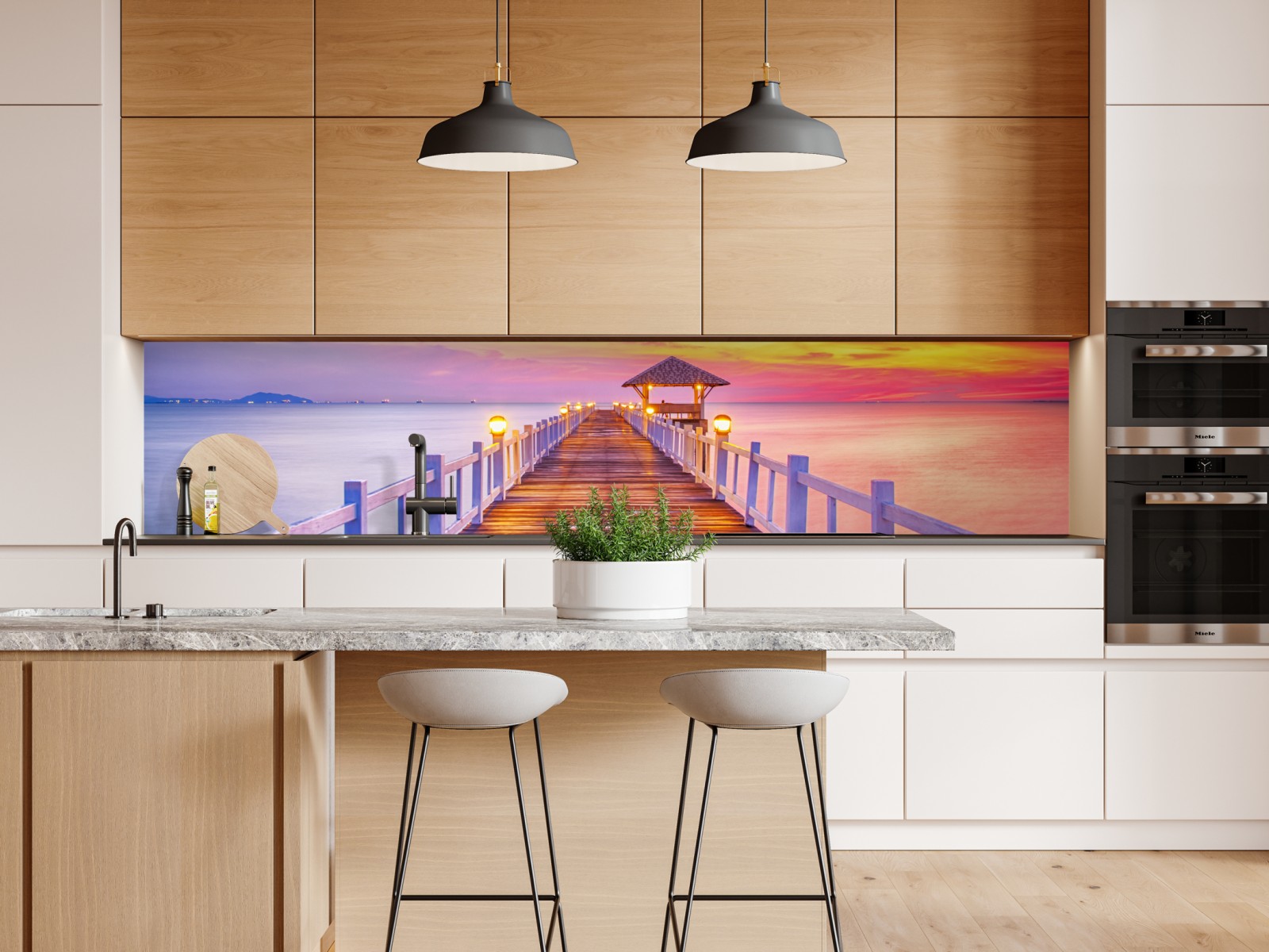 Repositionierbarer Aufkleber Sonnenuntergang am steg zum ruhigen horizont