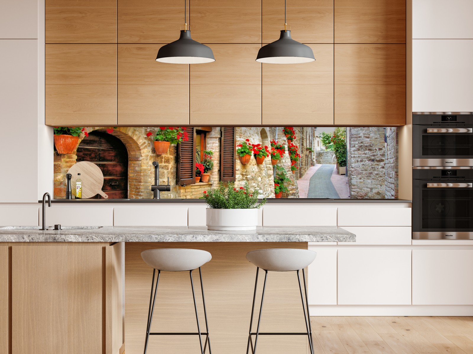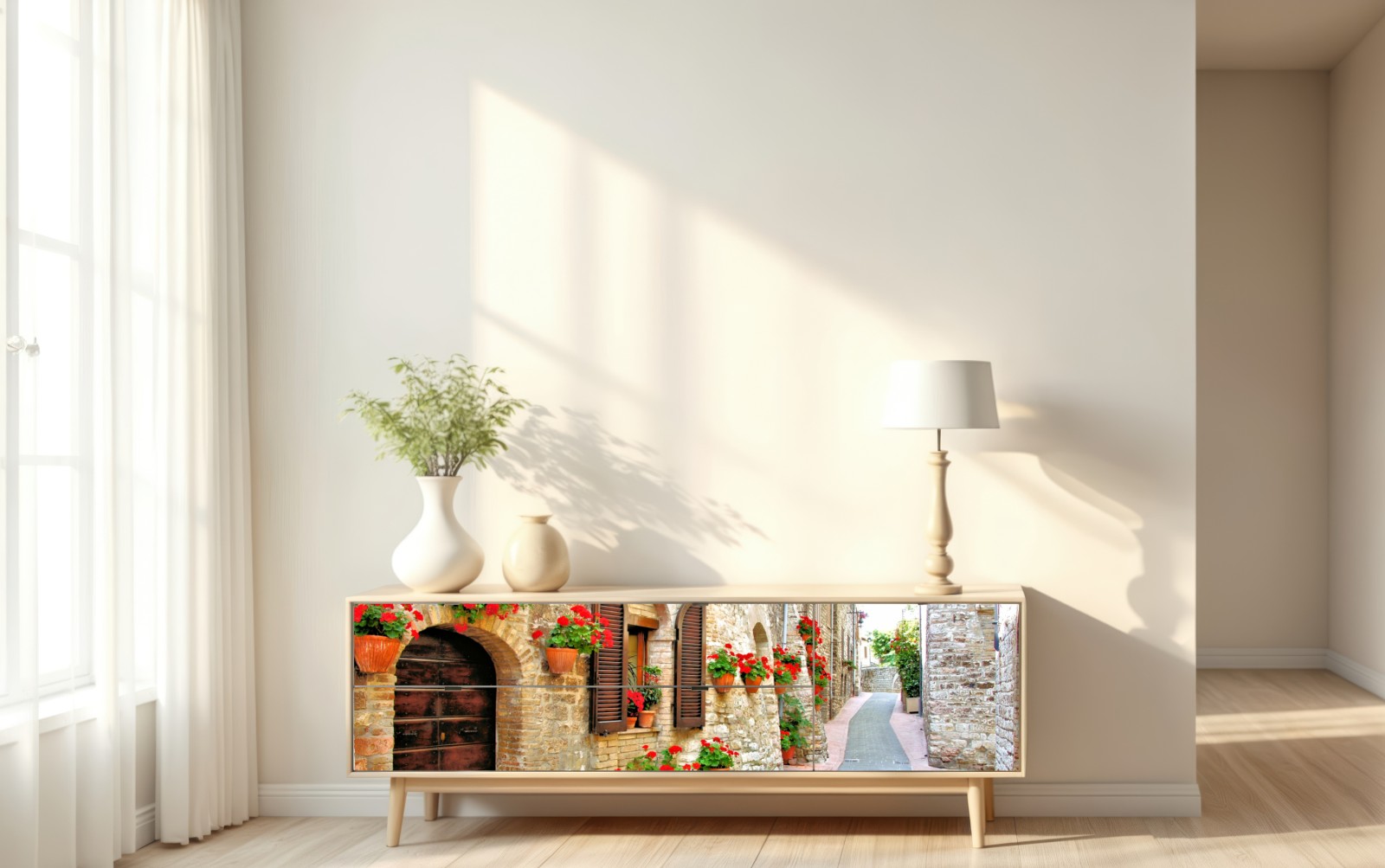 Repositionierbarer Aufkleber Sonnige steingasse mit roten geranien