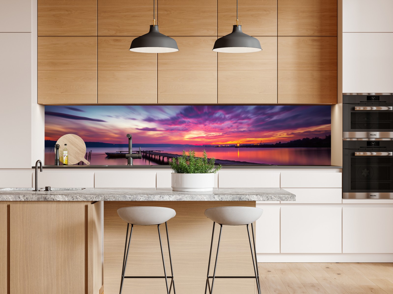 Repositionierbarer Aufkleber Sonnenuntergang über ruhigem see mit hölzernem steg