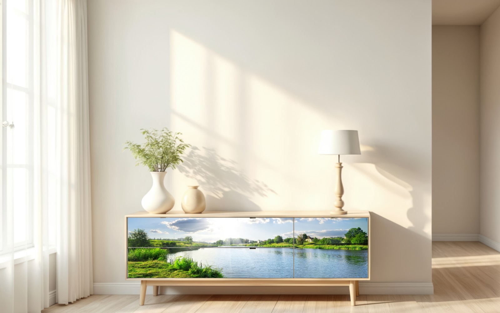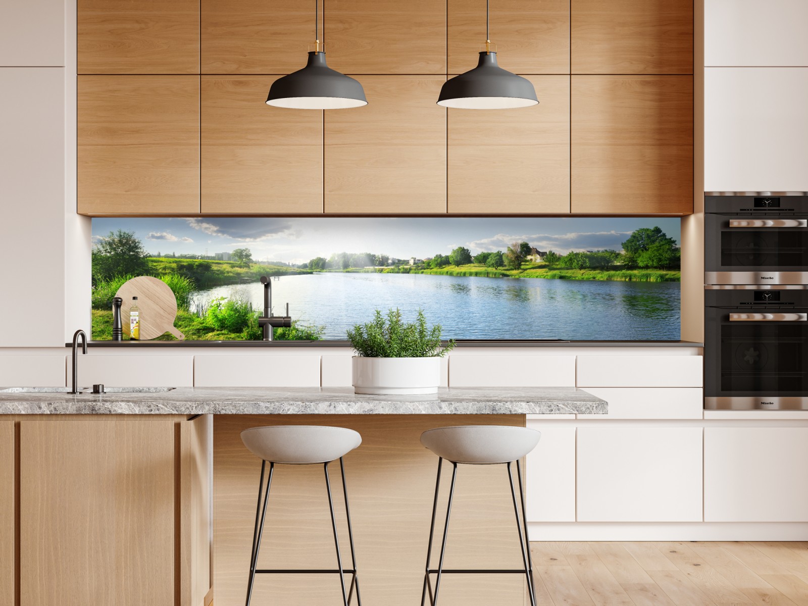 Repositionierbarer Aufkleber Sonnenbeschienenes flussufer mit üppigem grün