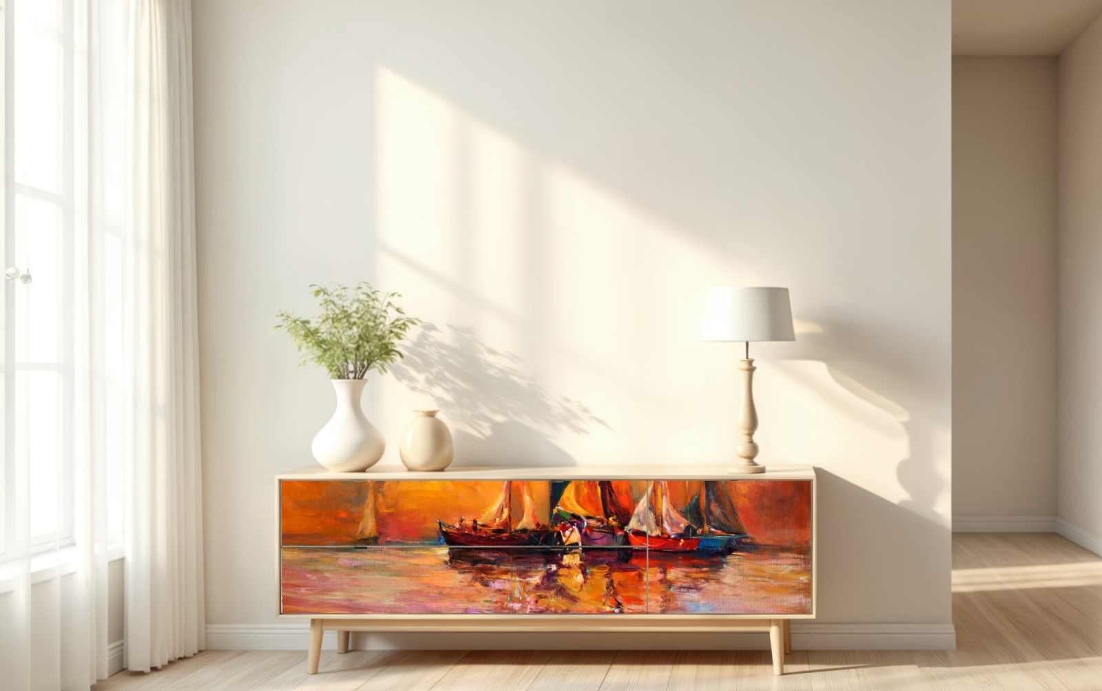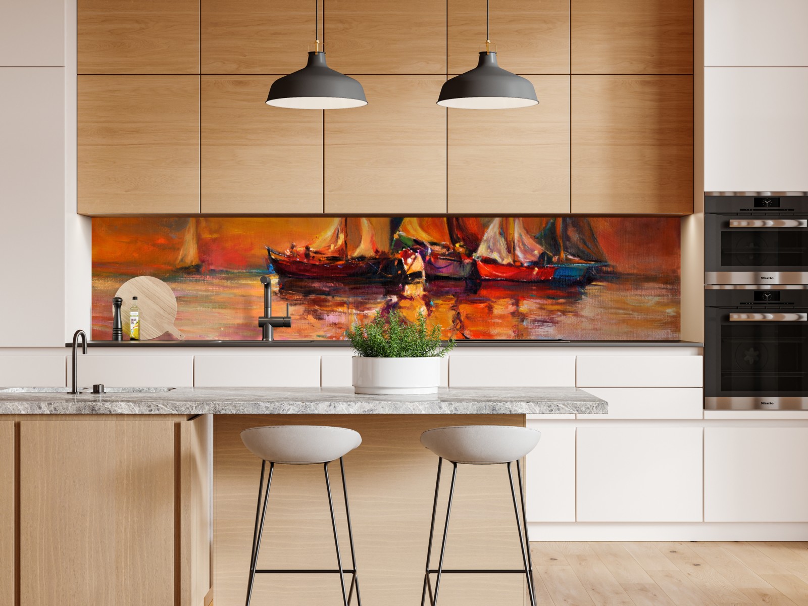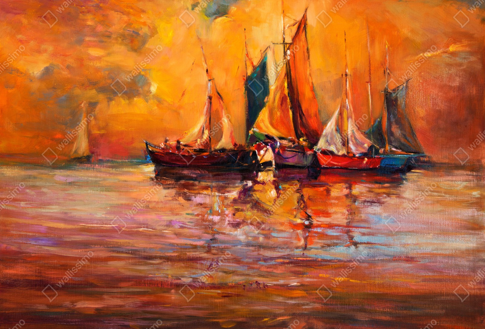 Repositionierbarer Aufkleber Goldener sonnenuntergang mit segelbooten
