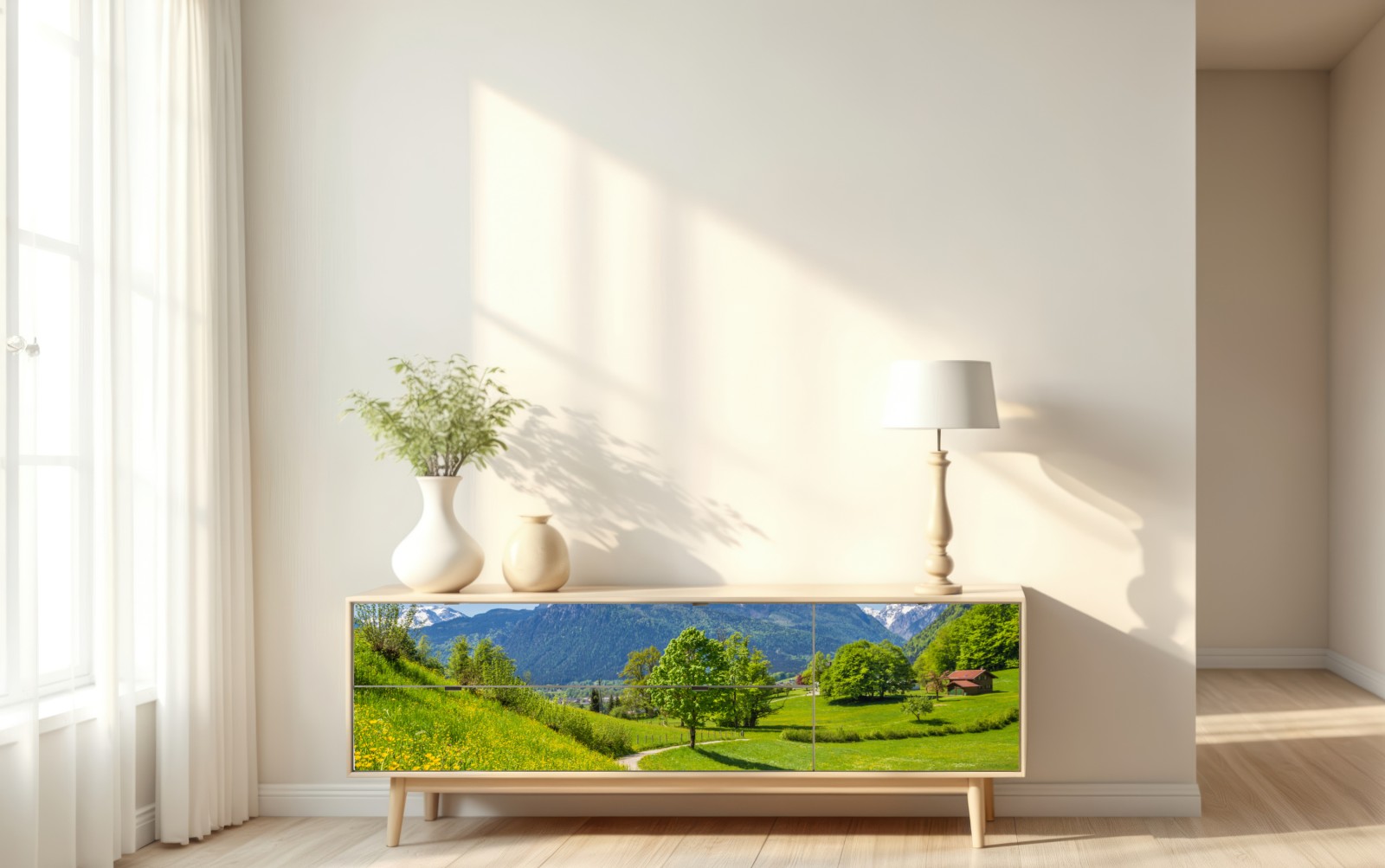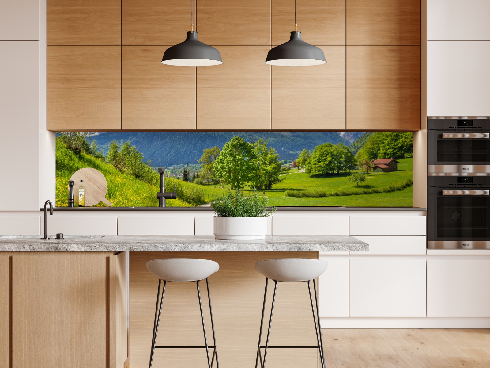 Repositionierbarer Aufkleber Alpine frühlingswiese mit schneebedeckten gipfeln