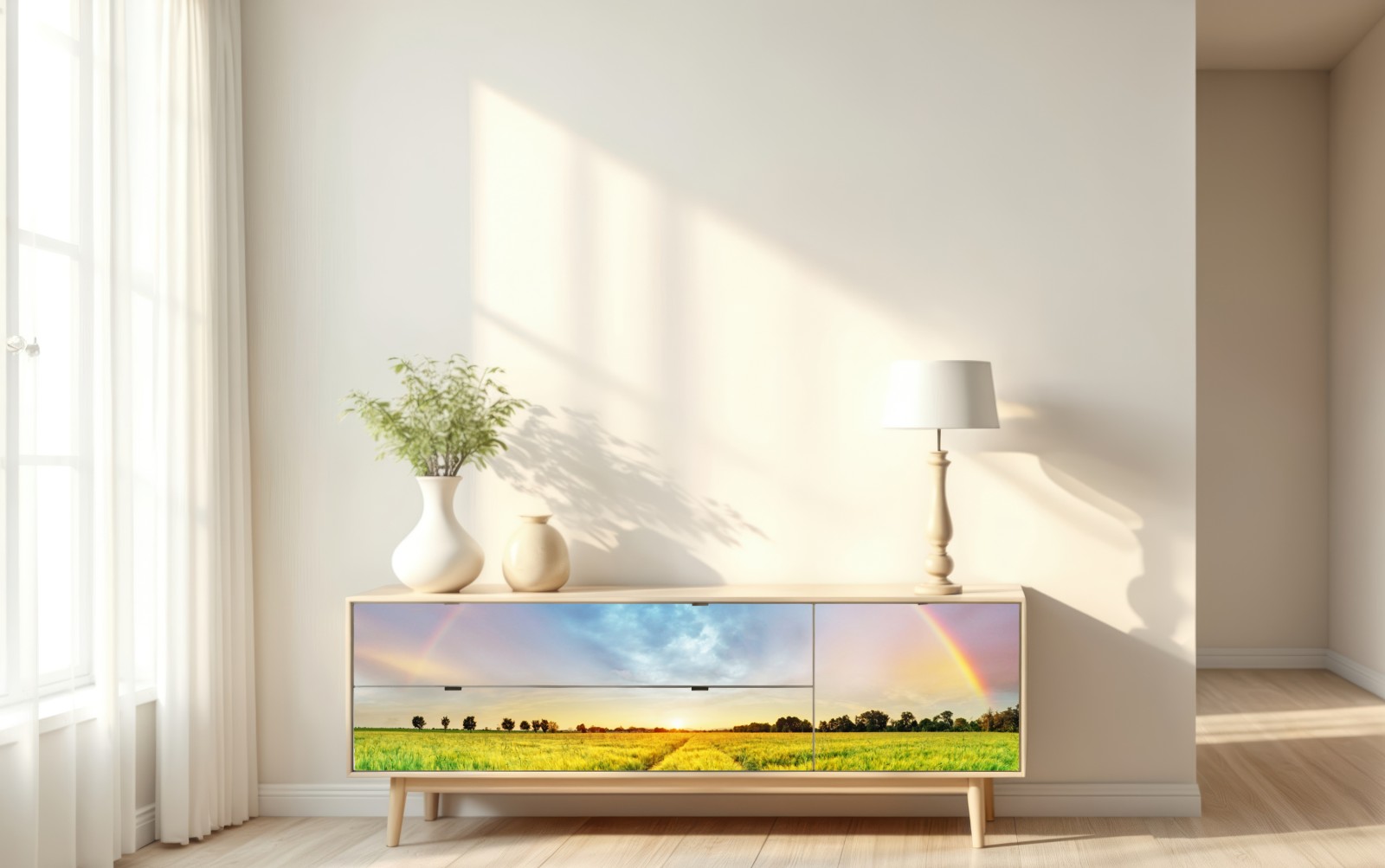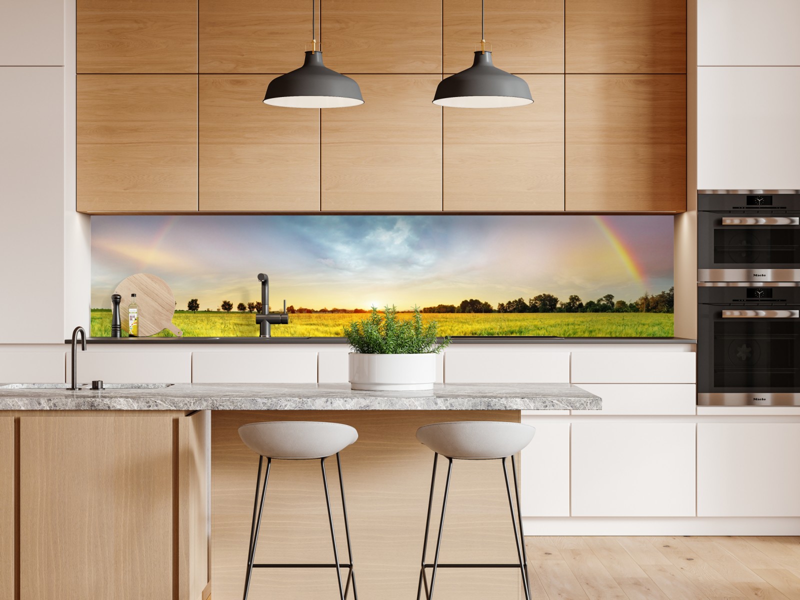 Repositionierbarer Aufkleber Regenbogen über goldenem weizenfeld bei sonnenuntergang