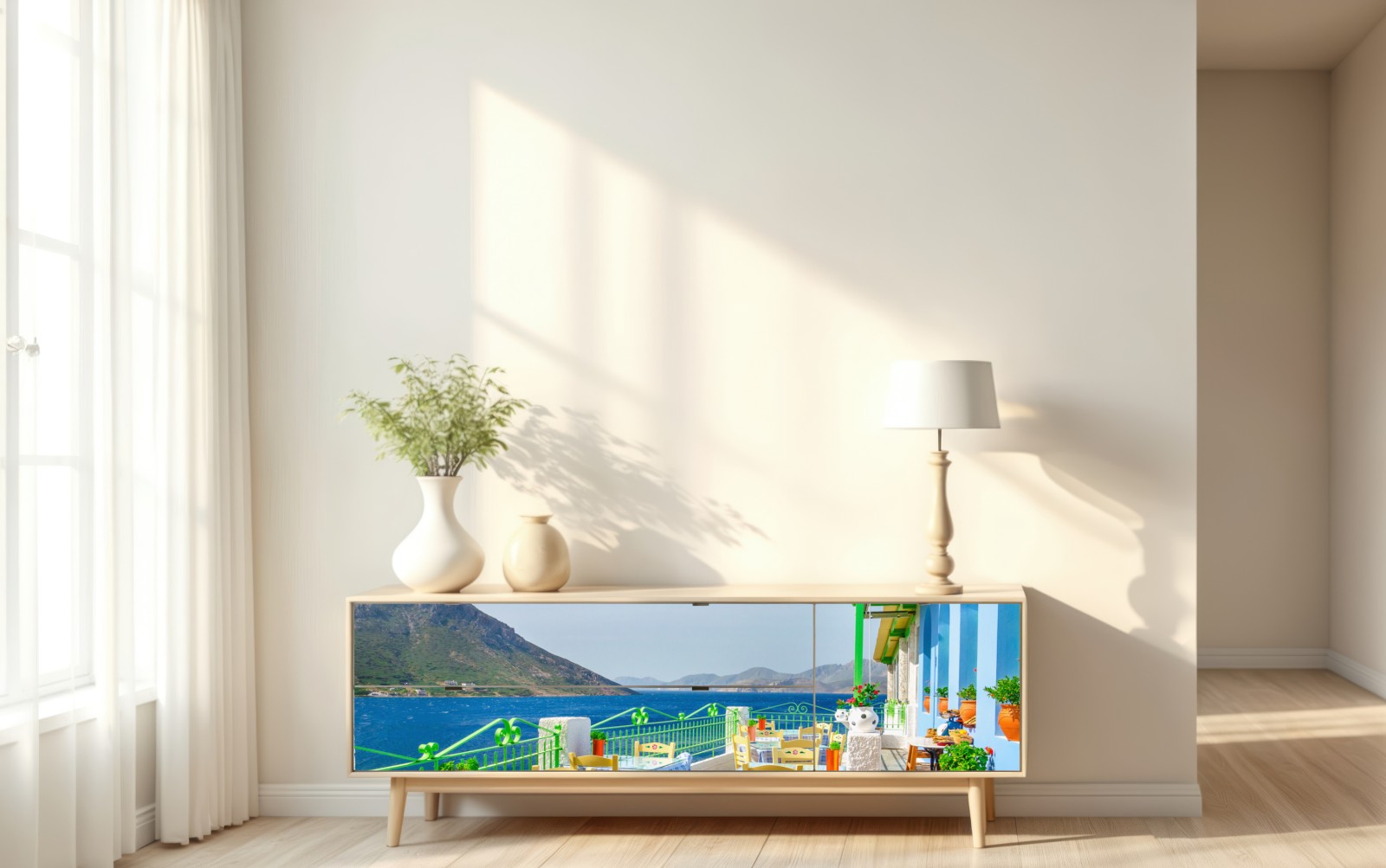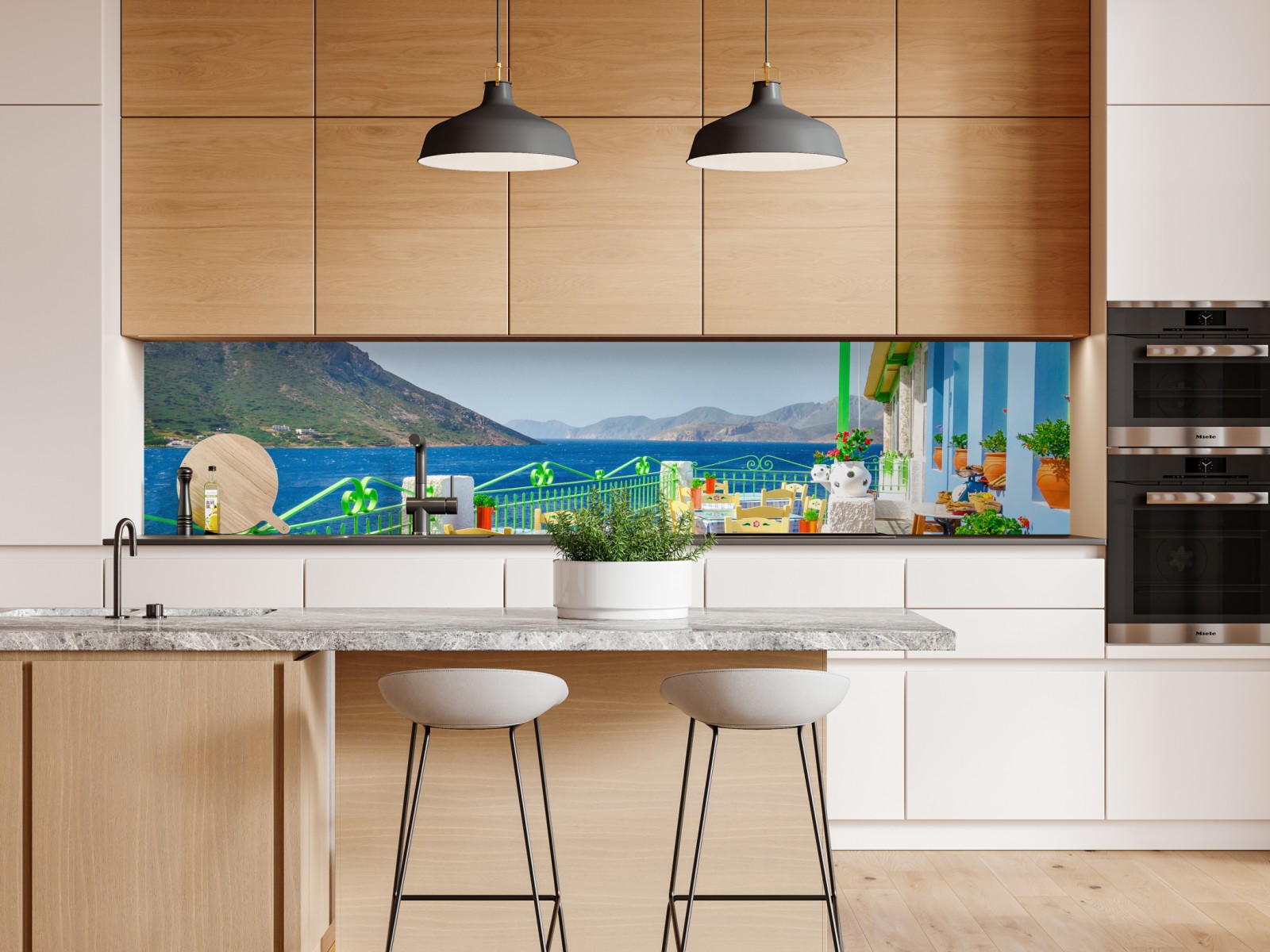 Repositionierbarer Aufkleber Sonnige terrasse am meer mit küstenblick