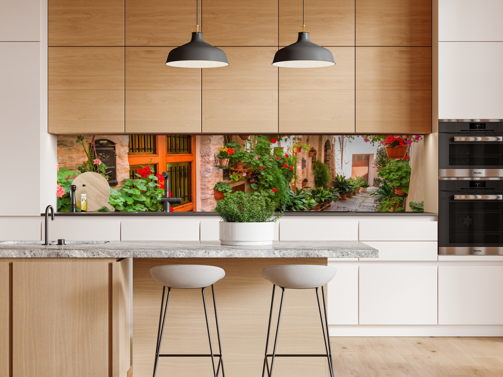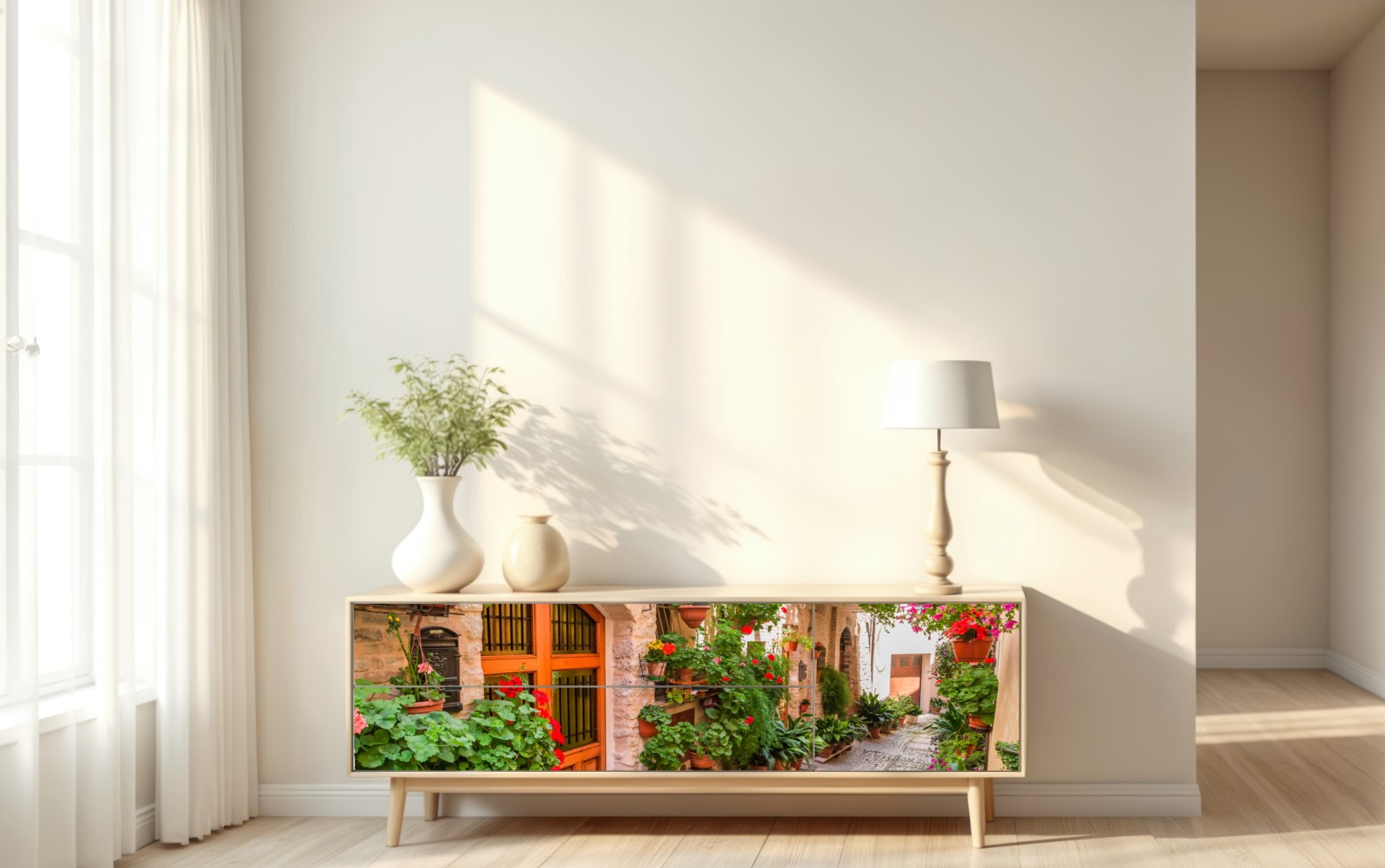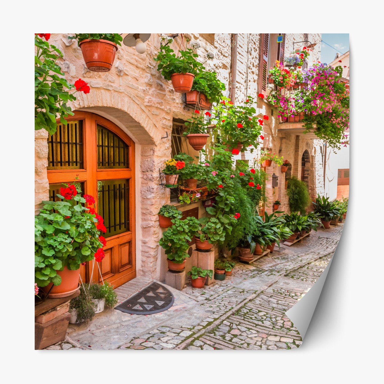 Repositionierbarer Aufkleber Sonnige gasse in Italien mit blühenden töpfen