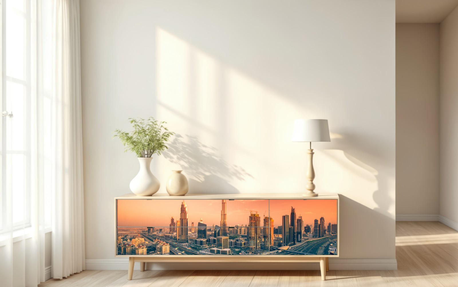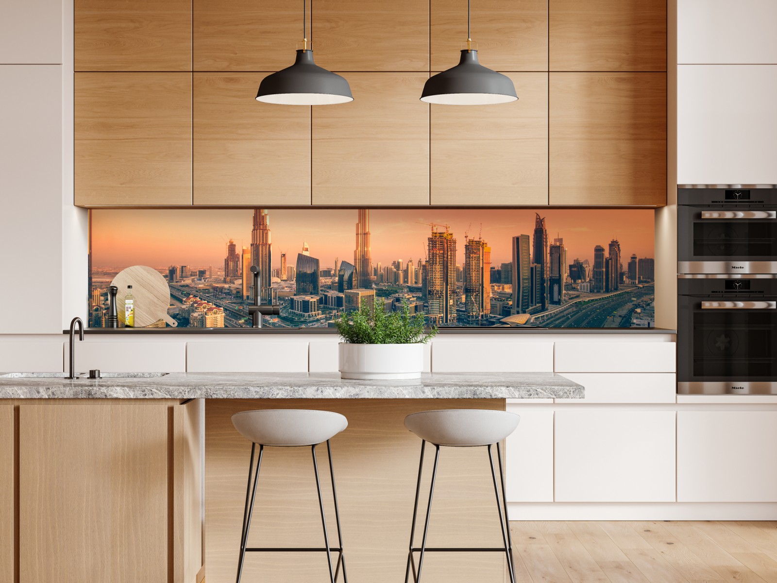 Repositionierbarer Aufkleber Dubai skyline bei sonnenuntergang