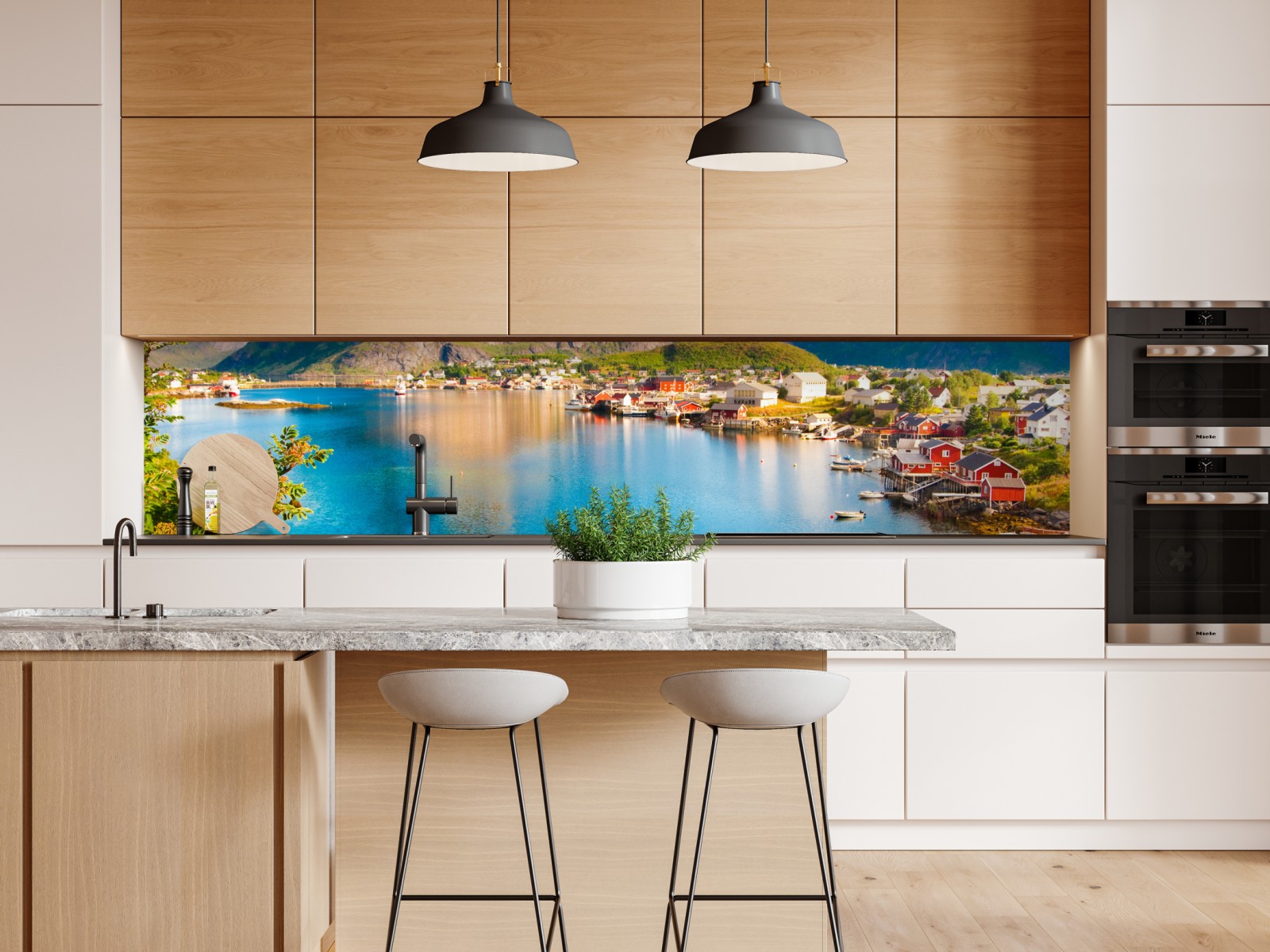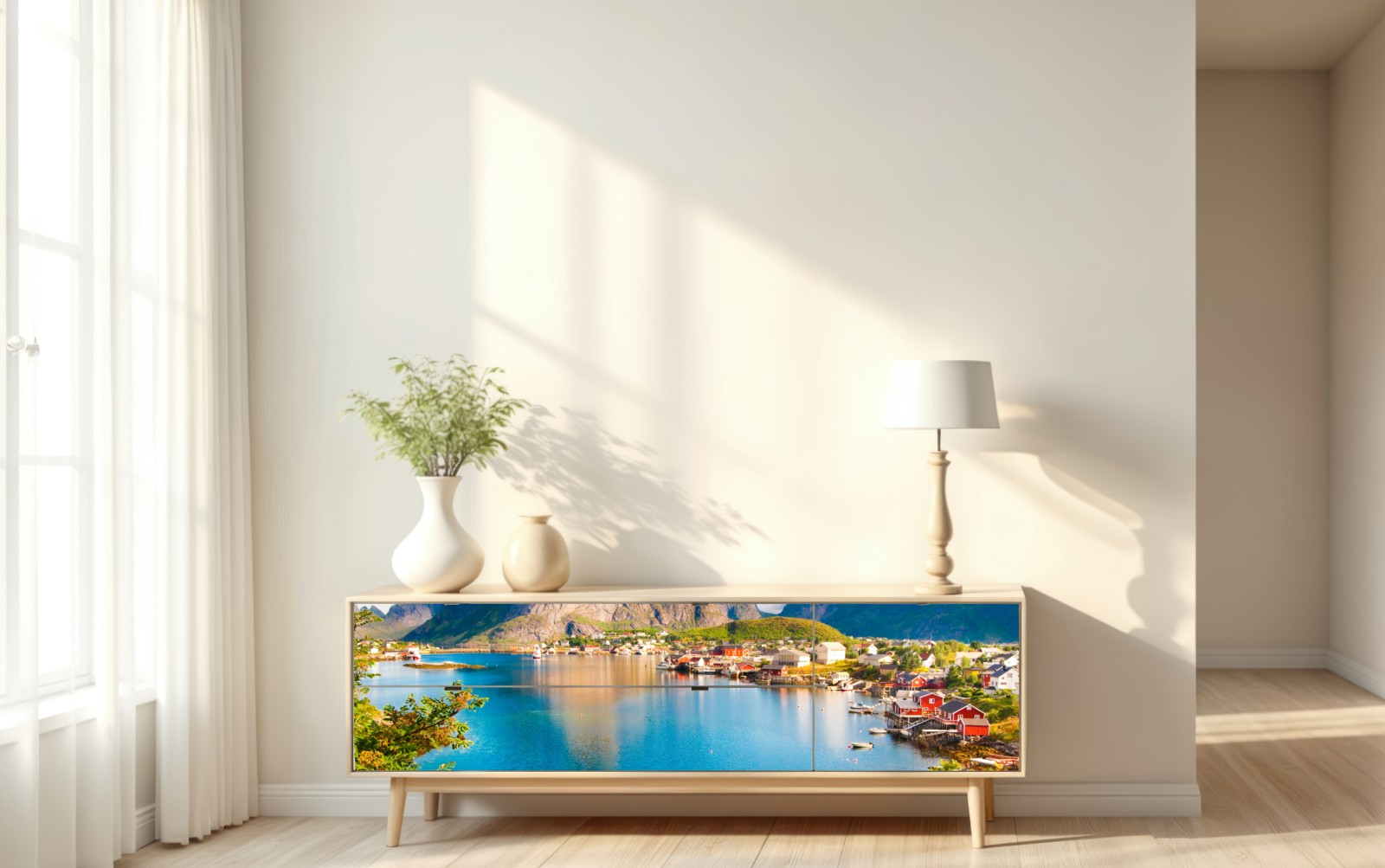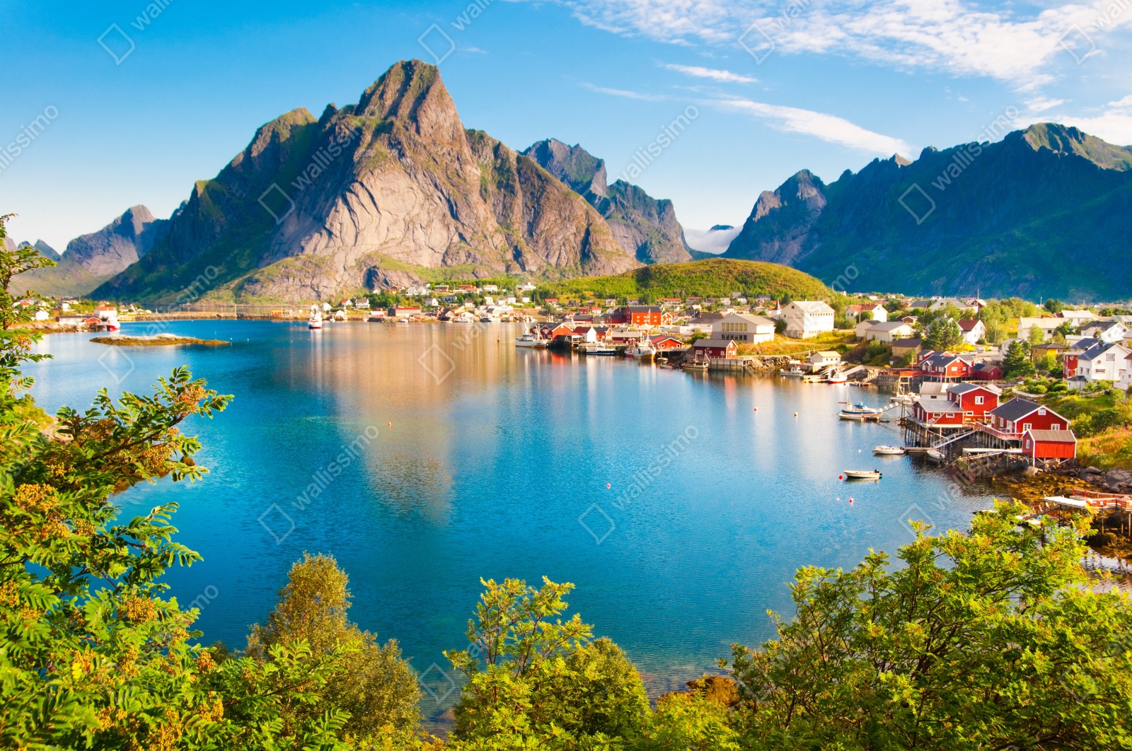 Repositionierbarer Aufkleber Ruhiges fjorddorf mit bergen und spiegelungen