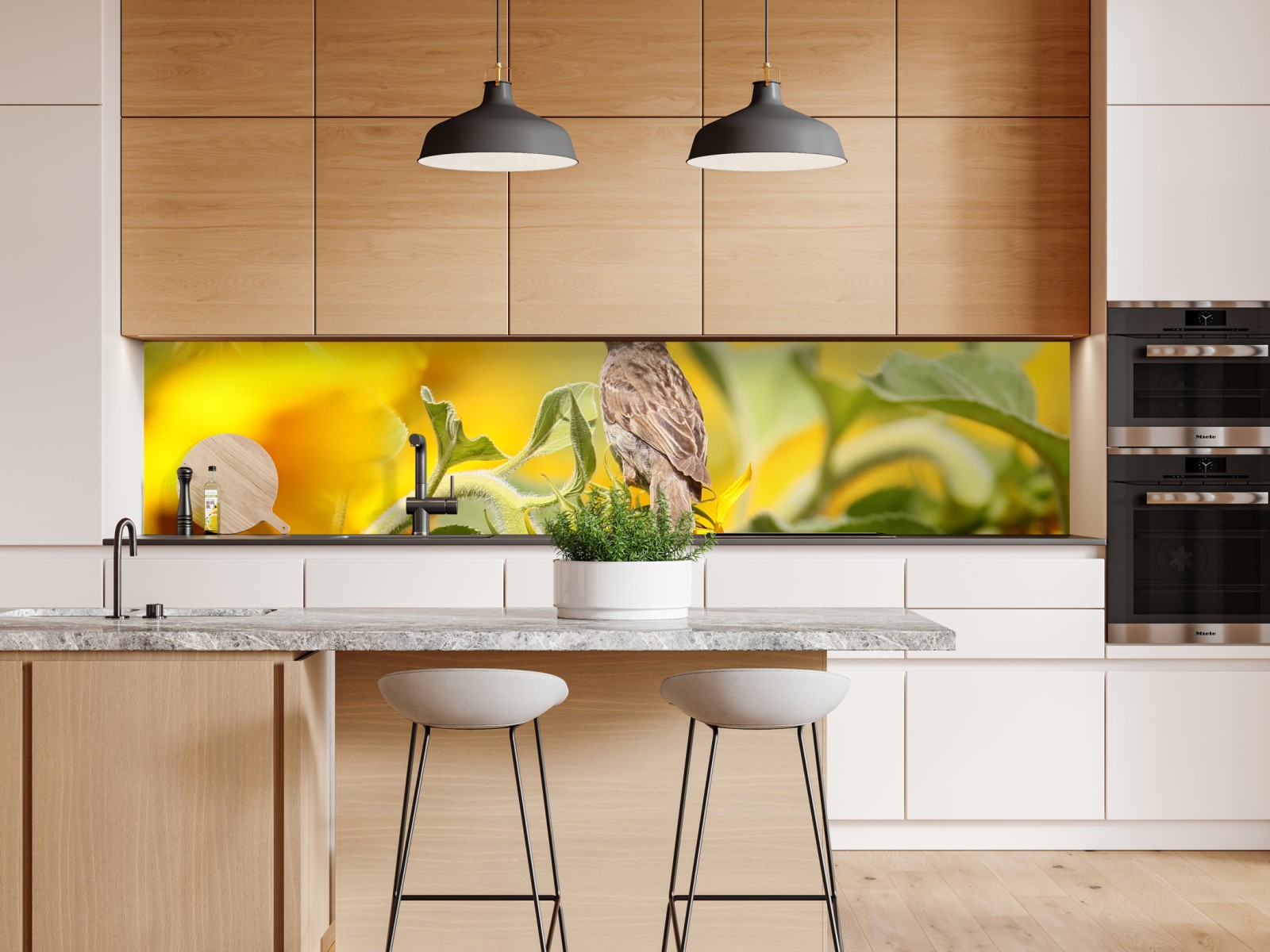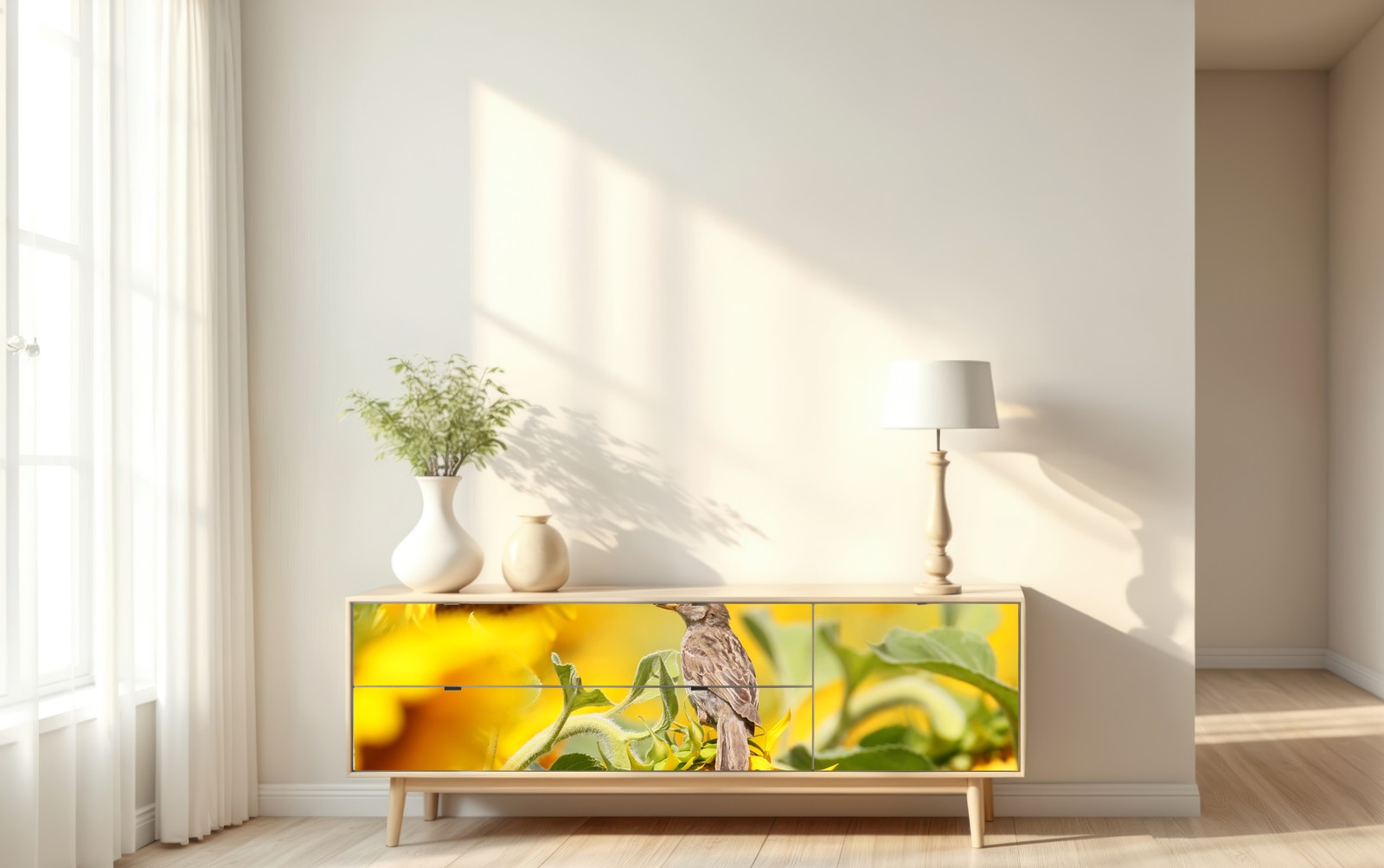 Repositionierbarer Aufkleber Spatz auf einer sonnenblume